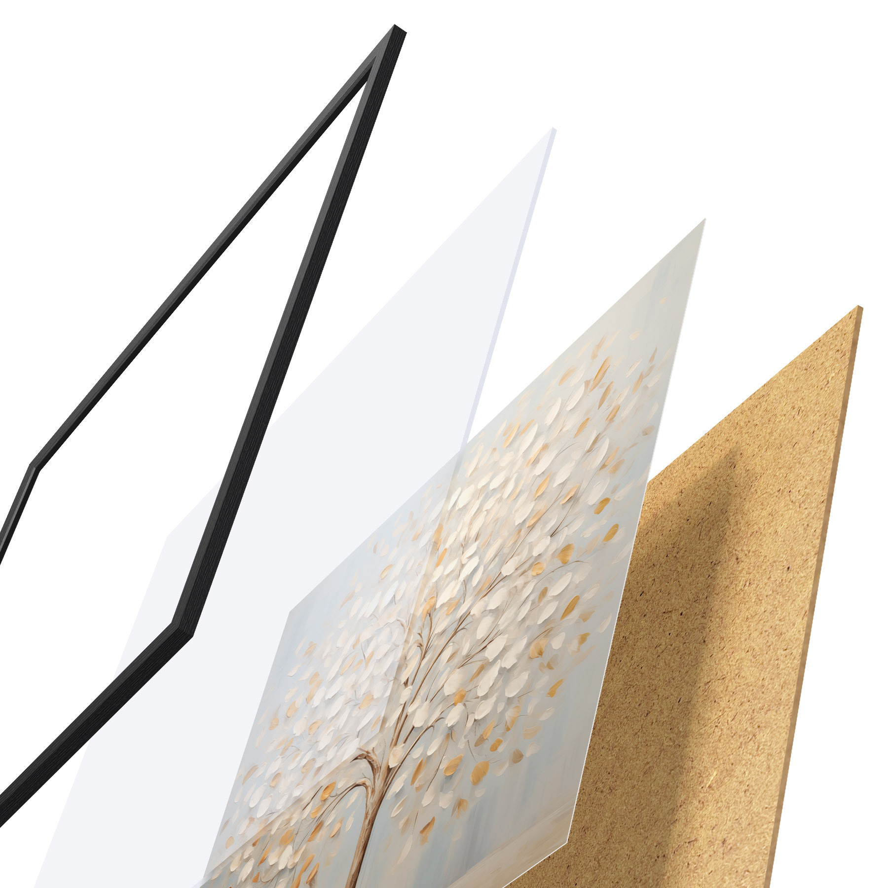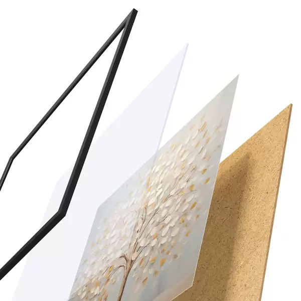 Plakát se skládá z rámu, plexiskla, tištěného obrazu a dřevotřískového podkladu. Díky úchytům na zadní straně lze plakát ihned zavěsit na zeď.