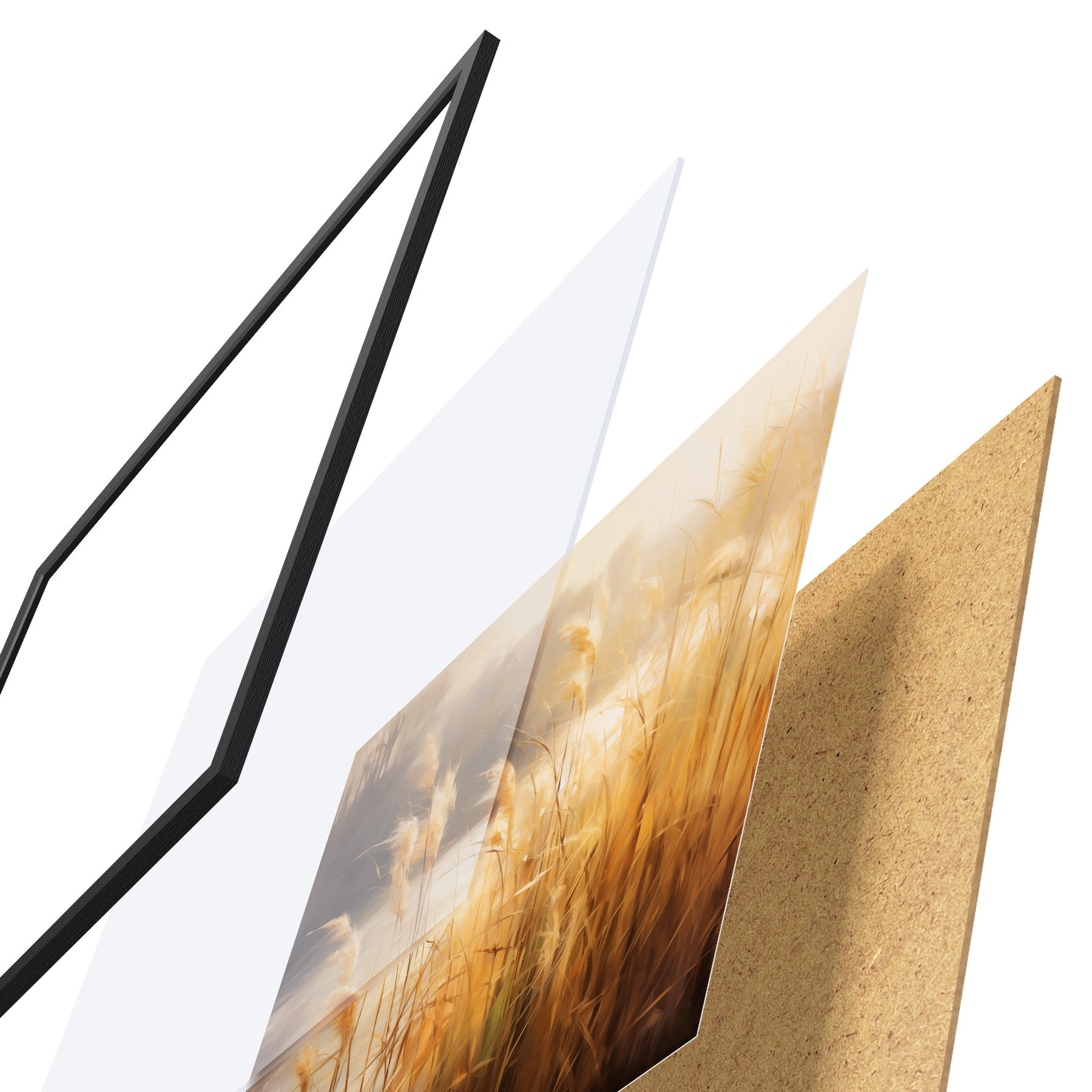 Plakát se skládá z rámu, plexiskla, tištěného obrazu a dřevotřískového podkladu. Díky úchytům na zadní straně lze plakát ihned zavěsit na zeď.