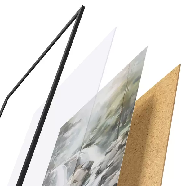 Plakát se skládá z rámu, plexiskla, tištěného obrazu a dřevotřískového podkladu. Díky úchytům na zadní straně lze plakát ihned zavěsit na zeď.