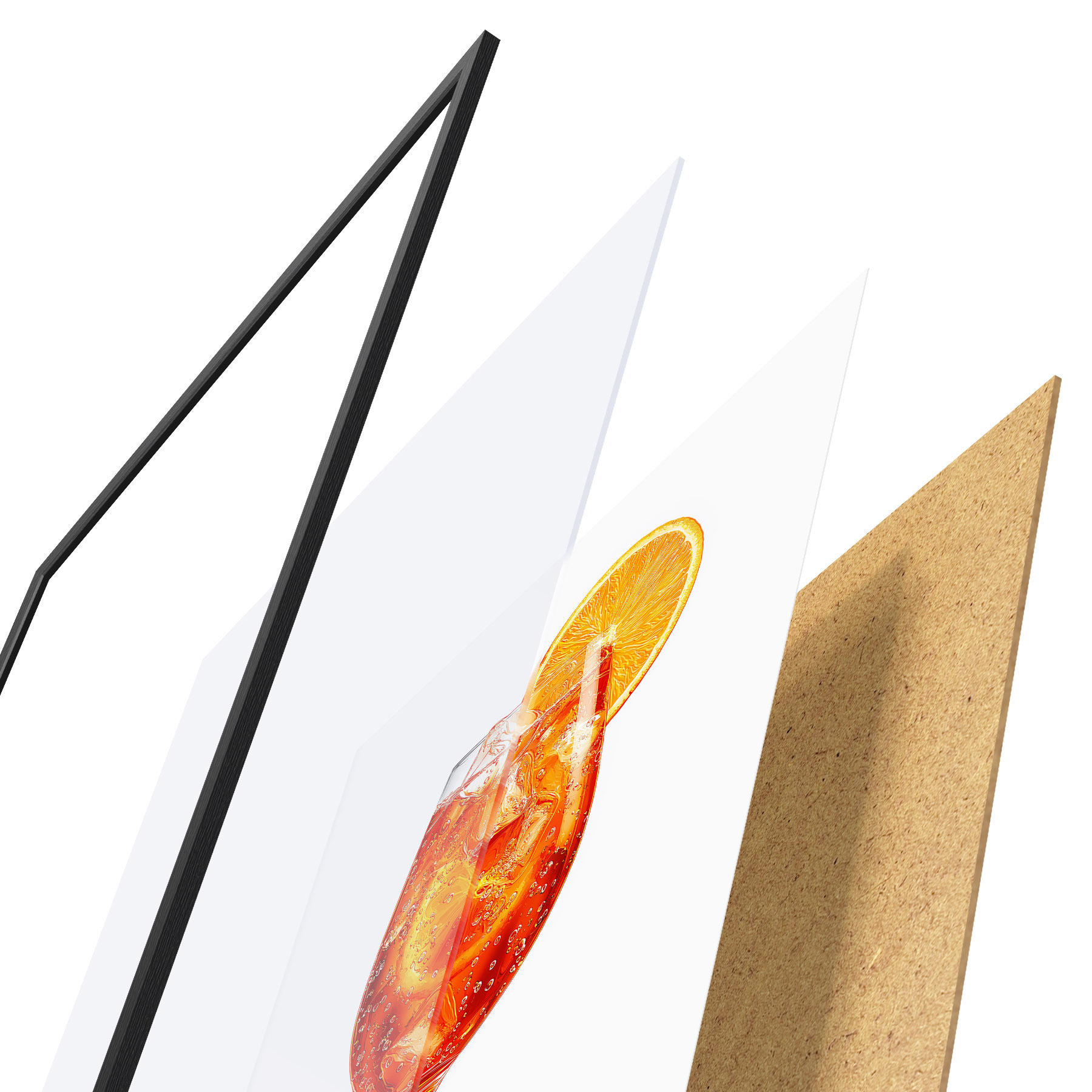 Plakát se skládá z rámu, plexiskla, tištěného obrazu a dřevotřískového podkladu. Díky úchytům na zadní straně lze plakát ihned zavěsit na zeď.