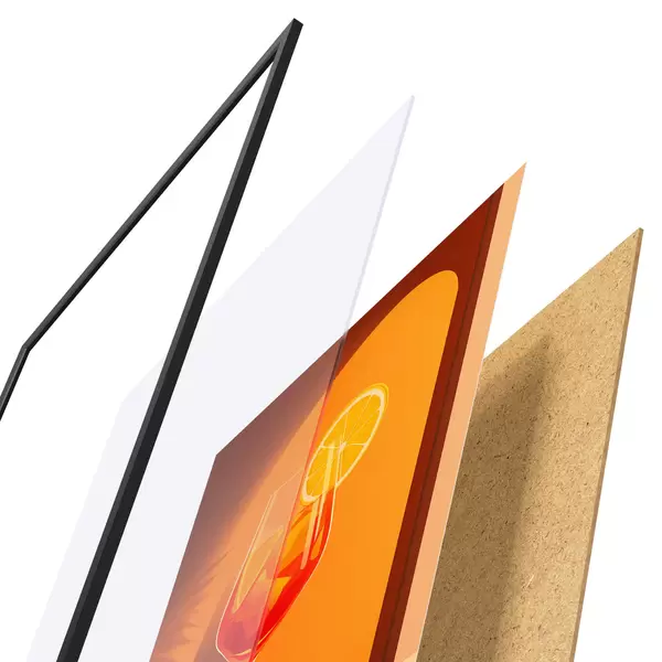 Plakát se skládá z rámu, plexiskla, tištěného obrazu a dřevotřískového podkladu. Díky úchytům na zadní straně lze plakát ihned zavěsit na zeď.