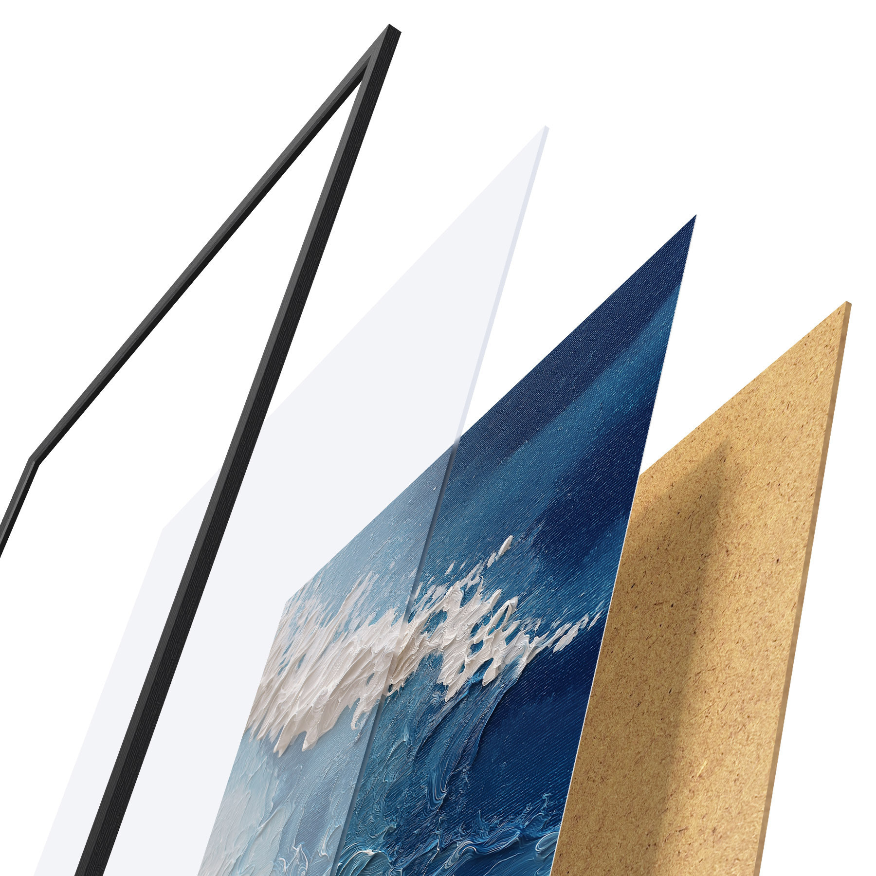 Plakát se skládá z rámu, plexiskla, tištěného obrazu a dřevotřískového podkladu. Díky úchytům na zadní straně lze plakát ihned zavěsit na zeď.