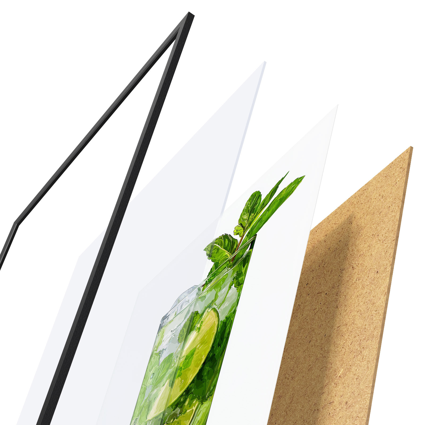 Plakát se skládá z rámu, plexiskla, tištěného obrazu a dřevotřískového podkladu. Díky úchytům na zadní straně lze plakát ihned zavěsit na zeď.