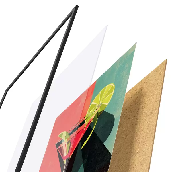 Plakát se skládá z rámu, plexiskla, tištěného obrazu a dřevotřískového podkladu. Díky úchytům na zadní straně lze plakát ihned zavěsit na zeď.