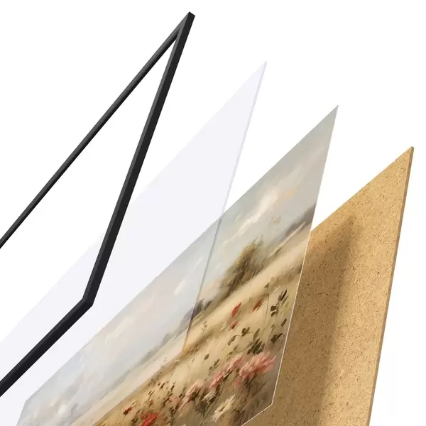 Plakát se skládá z rámu, plexiskla, tištěného obrazu a dřevotřískového podkladu. Díky úchytům na zadní straně lze plakát ihned zavěsit na zeď.