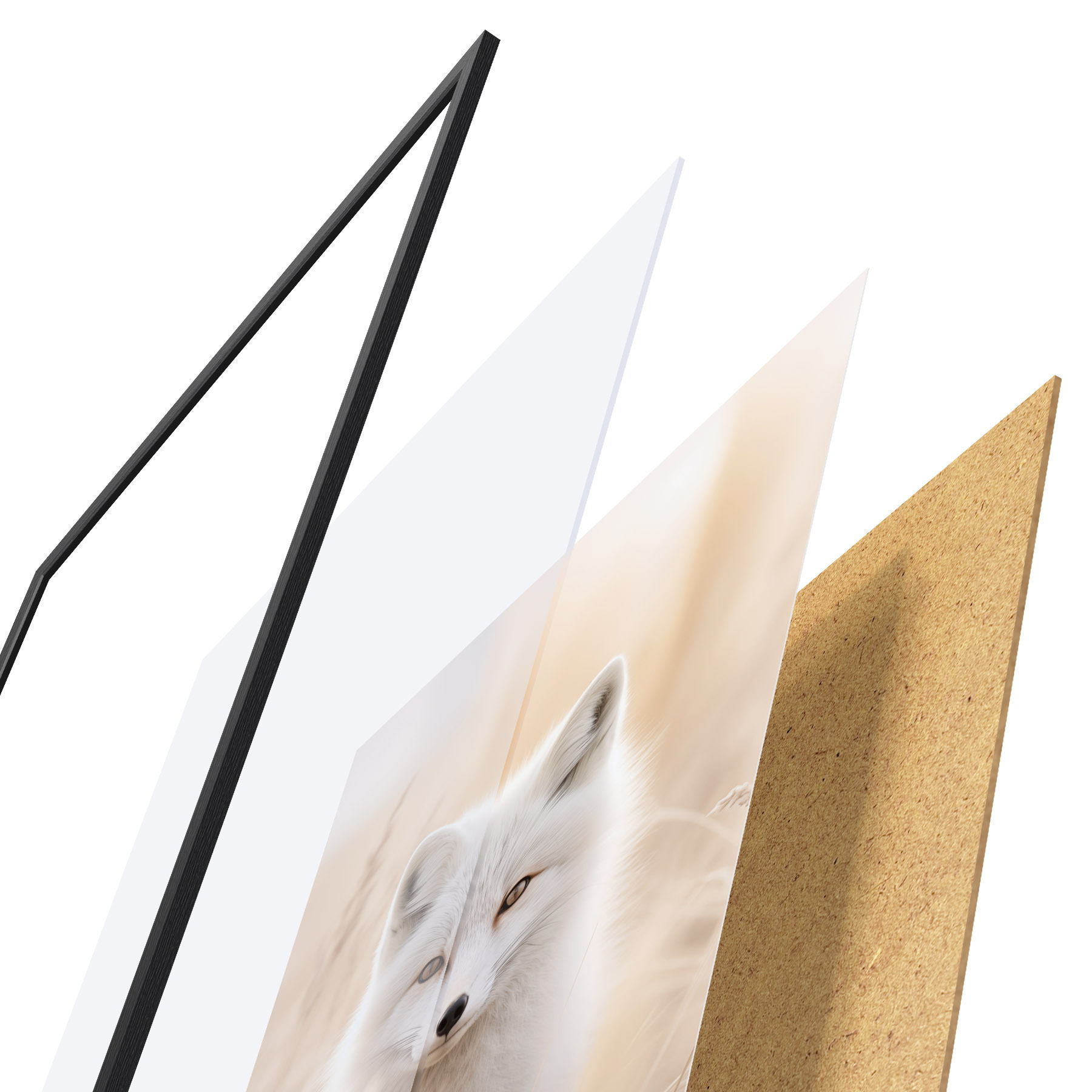 Plakát se skládá z rámu, plexiskla, tištěného obrazu a dřevotřískového podkladu. Díky úchytům na zadní straně lze plakát ihned zavěsit na zeď.