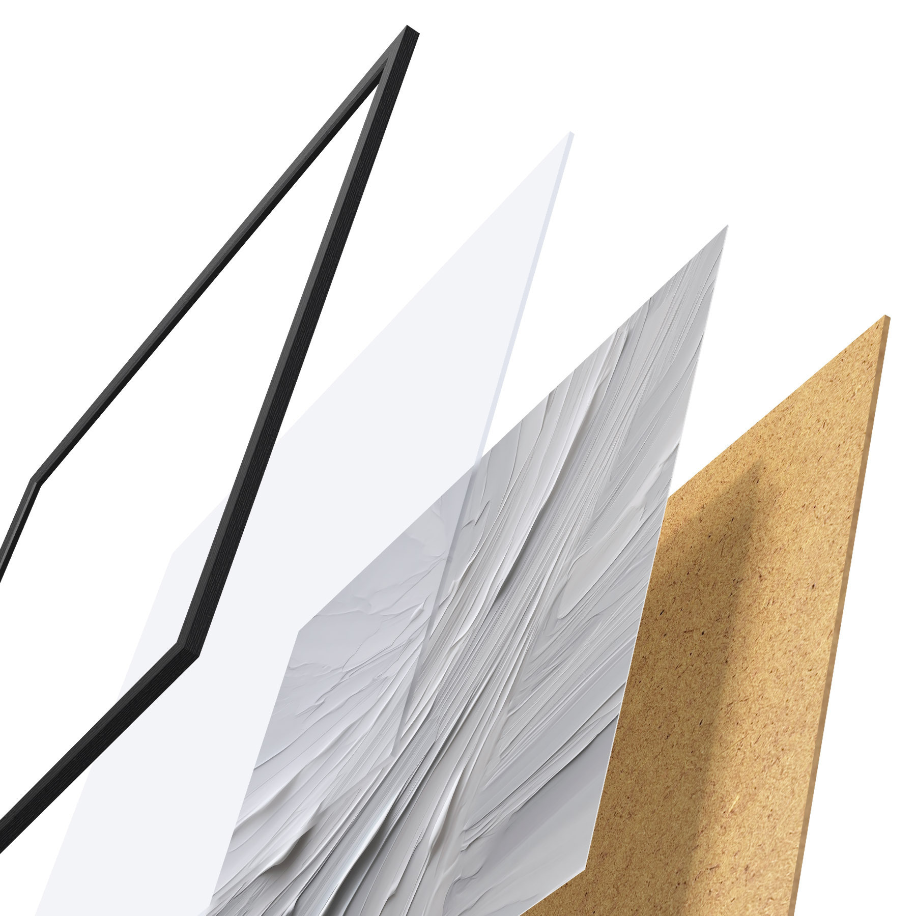 Plakát se skládá z rámu, plexiskla, tištěného obrazu a dřevotřískového podkladu. Díky úchytům na zadní straně lze plakát ihned zavěsit na zeď.