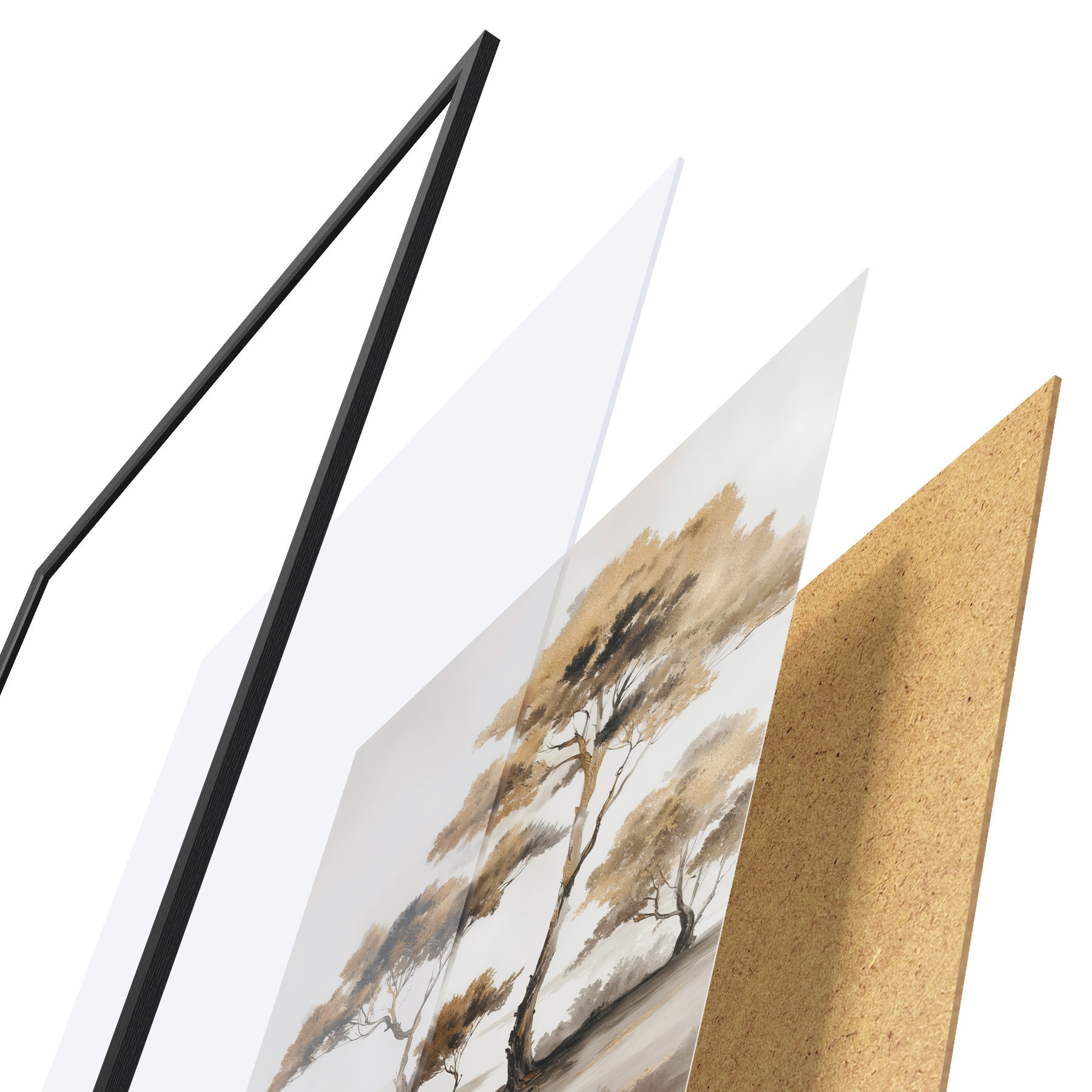 Plakát se skládá z rámu, plexiskla, tištěného obrazu a dřevotřískového podkladu. Díky úchytům na zadní straně lze plakát ihned zavěsit na zeď.