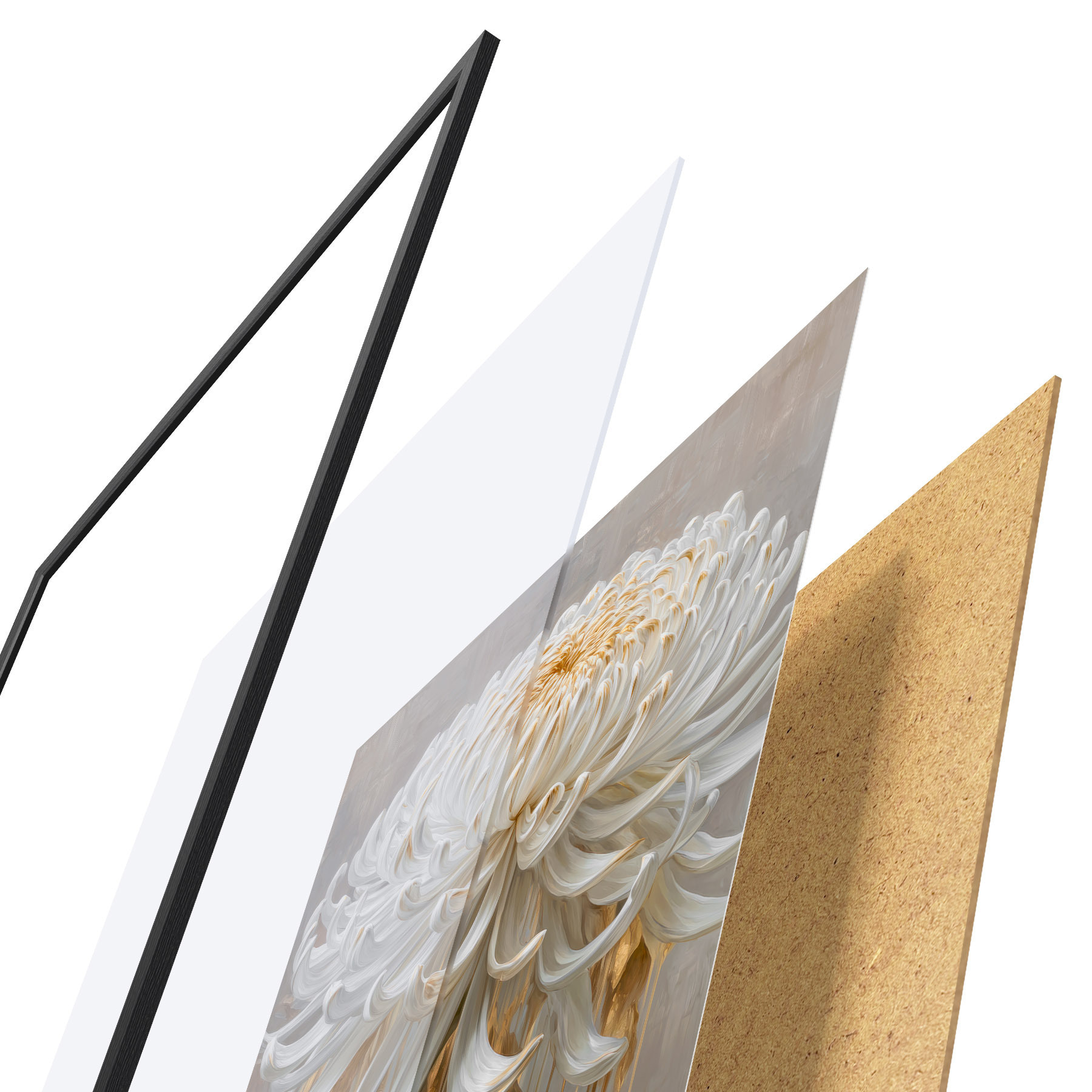 Plakát se skládá z rámu, plexiskla, tištěného obrazu a dřevotřískového podkladu. Díky úchytům na zadní straně lze plakát ihned zavěsit na zeď.