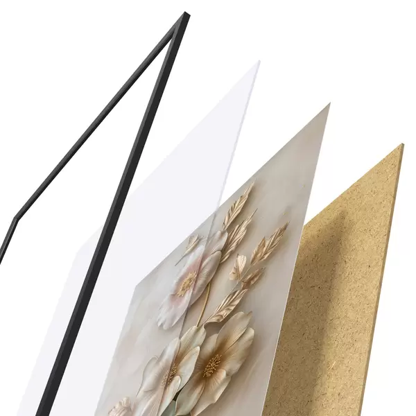 Plakát se skládá z rámu, plexiskla, tištěného obrazu a dřevotřískového podkladu. Díky úchytům na zadní straně lze plakát ihned zavěsit na zeď.