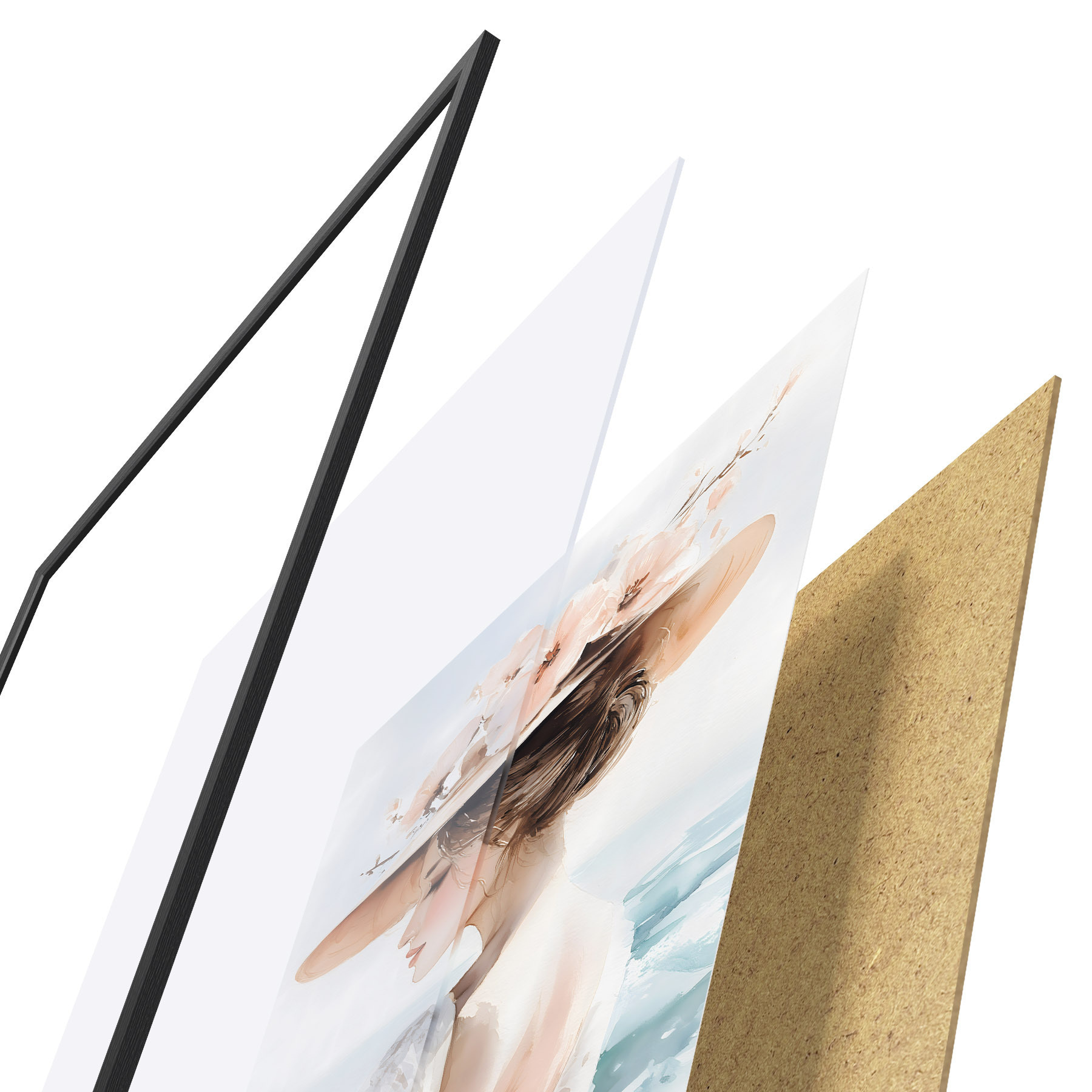 Plakát se skládá z rámu, plexiskla, tištěného obrazu a dřevotřískového podkladu. Díky úchytům na zadní straně lze plakát ihned zavěsit na zeď.
