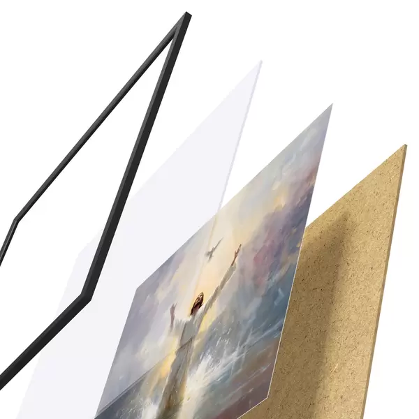 Plakát se skládá z rámu, plexiskla, tištěného obrazu a dřevotřískového podkladu. Díky úchytům na zadní straně lze plakát ihned zavěsit na zeď.
