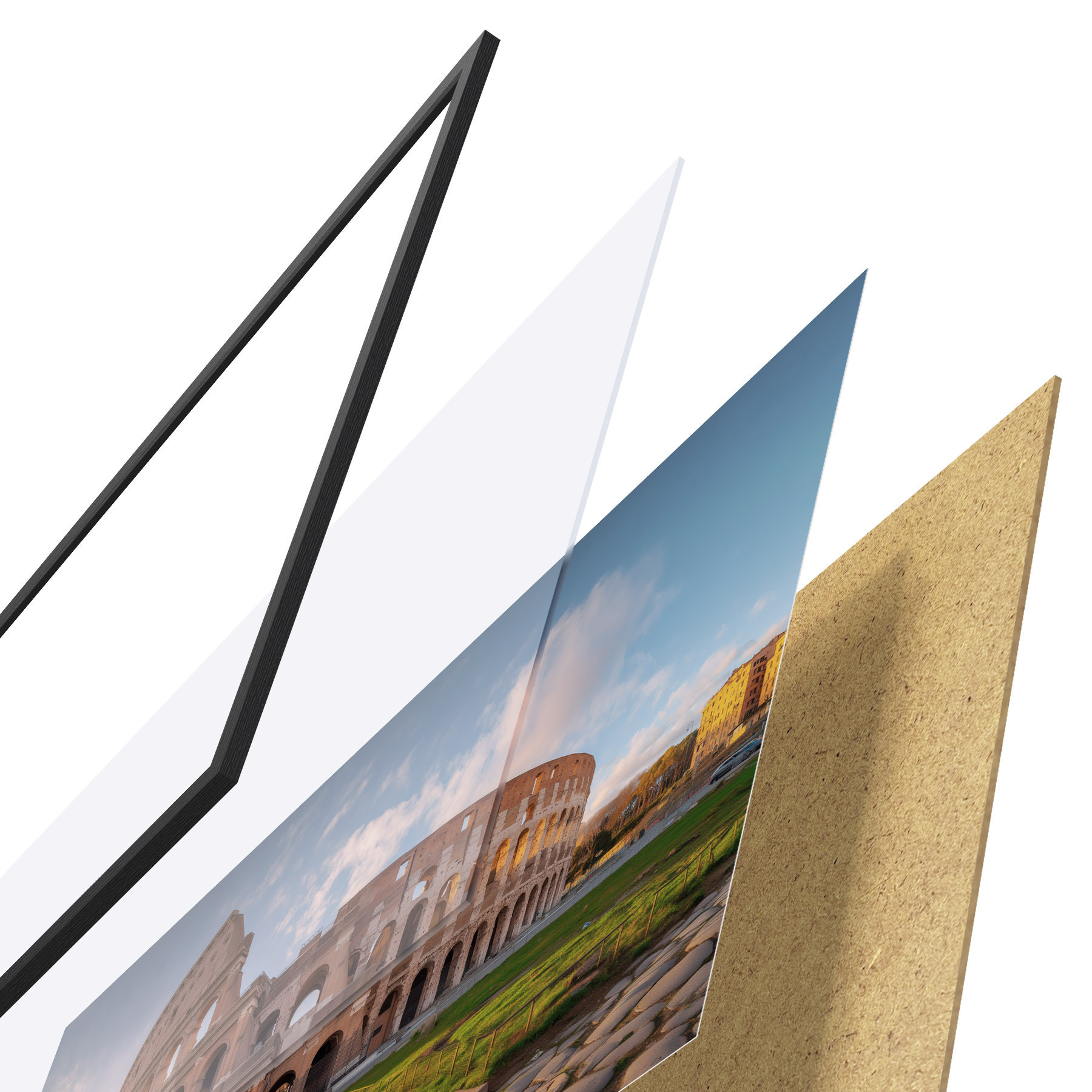 Plakát se skládá z rámu, plexiskla, tištěného obrazu a dřevotřískového podkladu. Díky úchytům na zadní straně lze plakát ihned zavěsit na zeď.