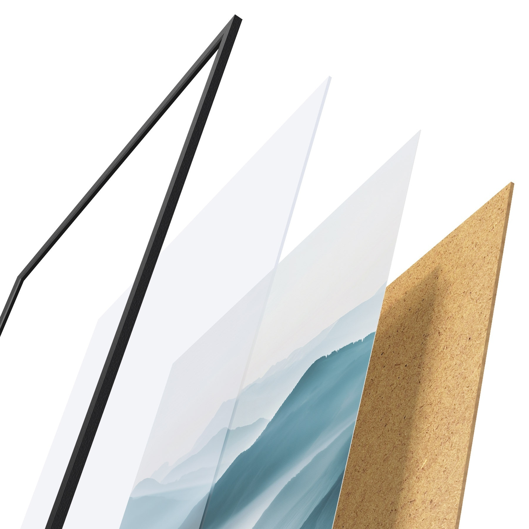 Plakát se skládá z rámu, plexiskla, tištěného obrazu a dřevotřískového podkladu. Díky úchytům na zadní straně lze plakát ihned zavěsit na zeď.