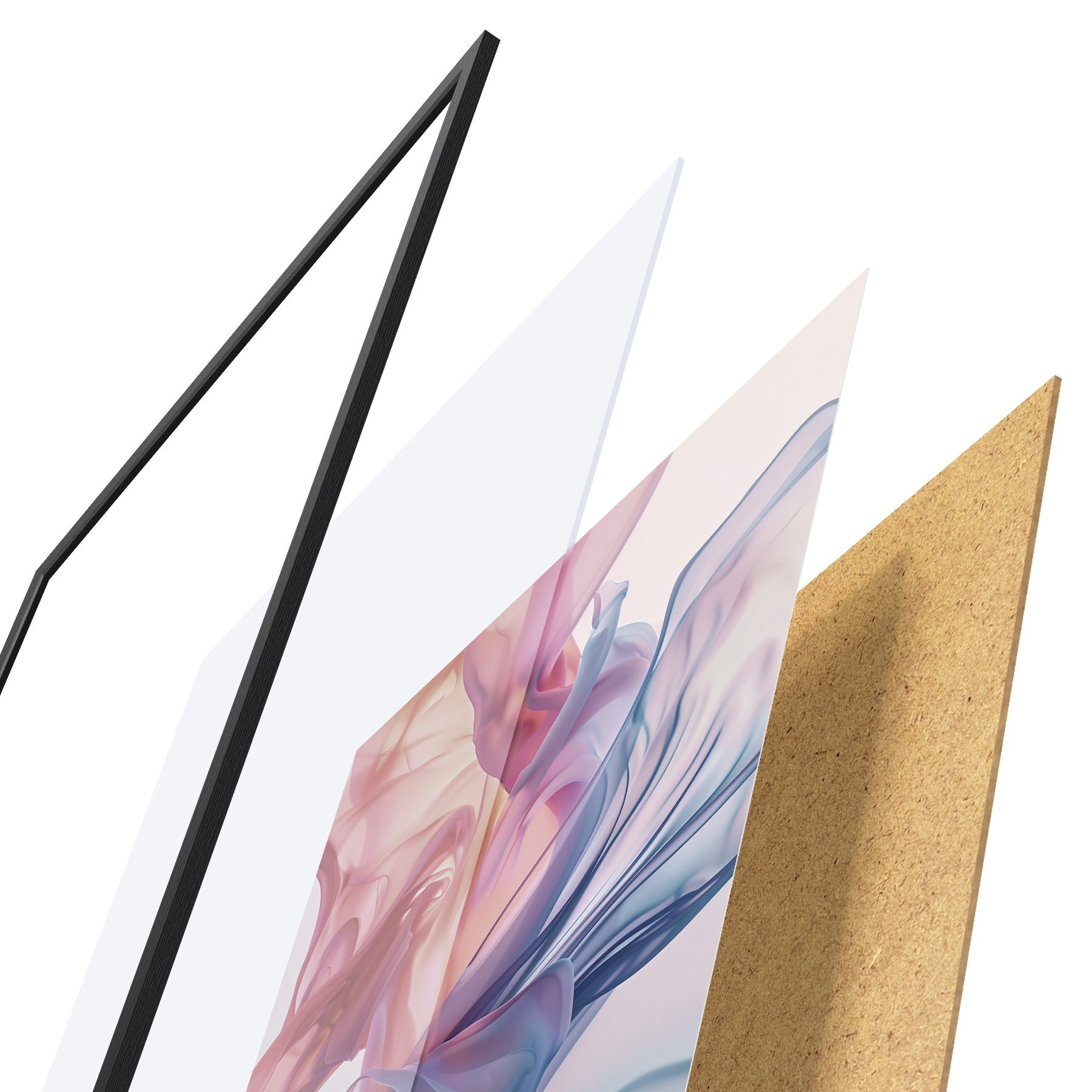 Plakát se skládá z rámu, plexiskla, tištěného obrazu a dřevotřískového podkladu. Díky úchytům na zadní straně lze plakát ihned zavěsit na zeď.