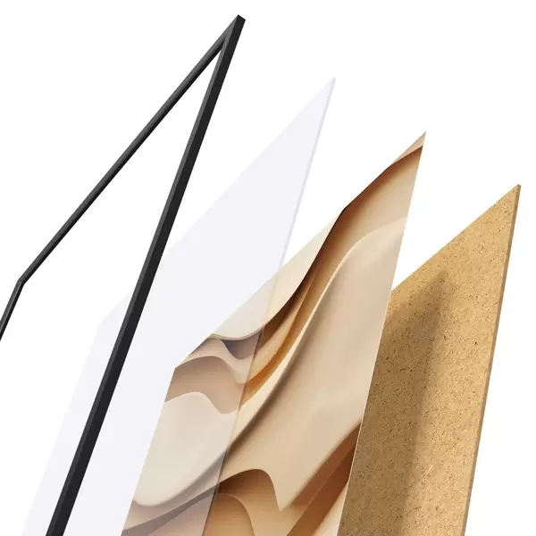 Plakát se skládá z rámu, plexiskla, tištěného obrazu a dřevotřískového podkladu. Díky úchytům na zadní straně lze plakát ihned zavěsit na zeď.