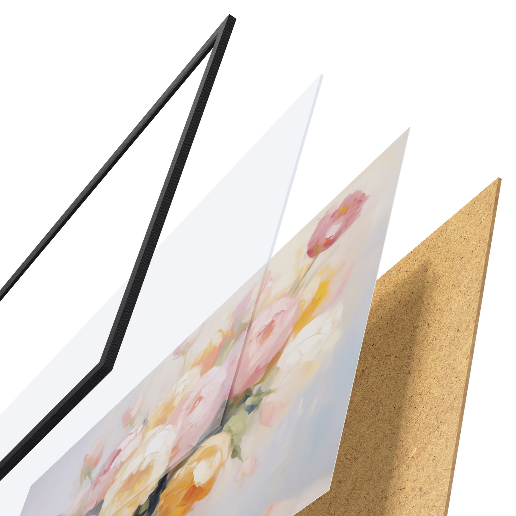 Plakát se skládá z rámu, plexiskla, tištěného obrazu a dřevotřískového podkladu. Díky úchytům na zadní straně lze plakát ihned zavěsit na zeď.