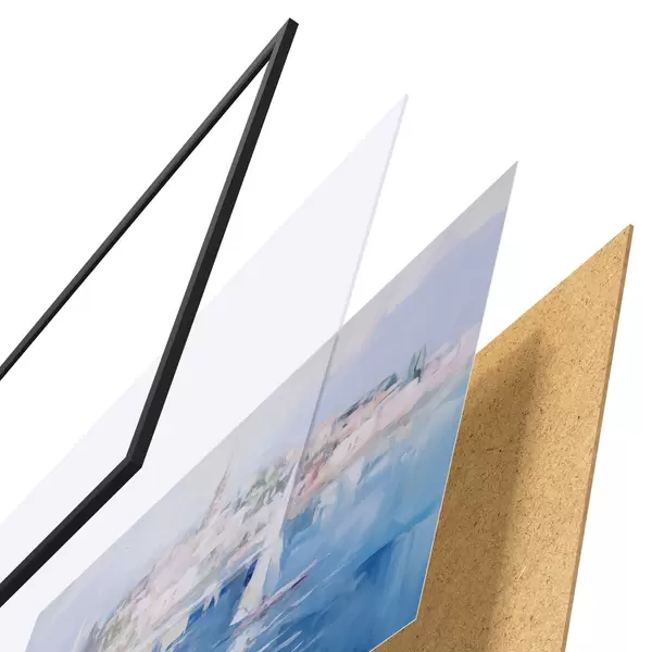 Plakát se skládá z rámu, plexiskla, tištěného obrazu a dřevotřískového podkladu. Díky úchytům na zadní straně lze plakát ihned zavěsit na zeď.