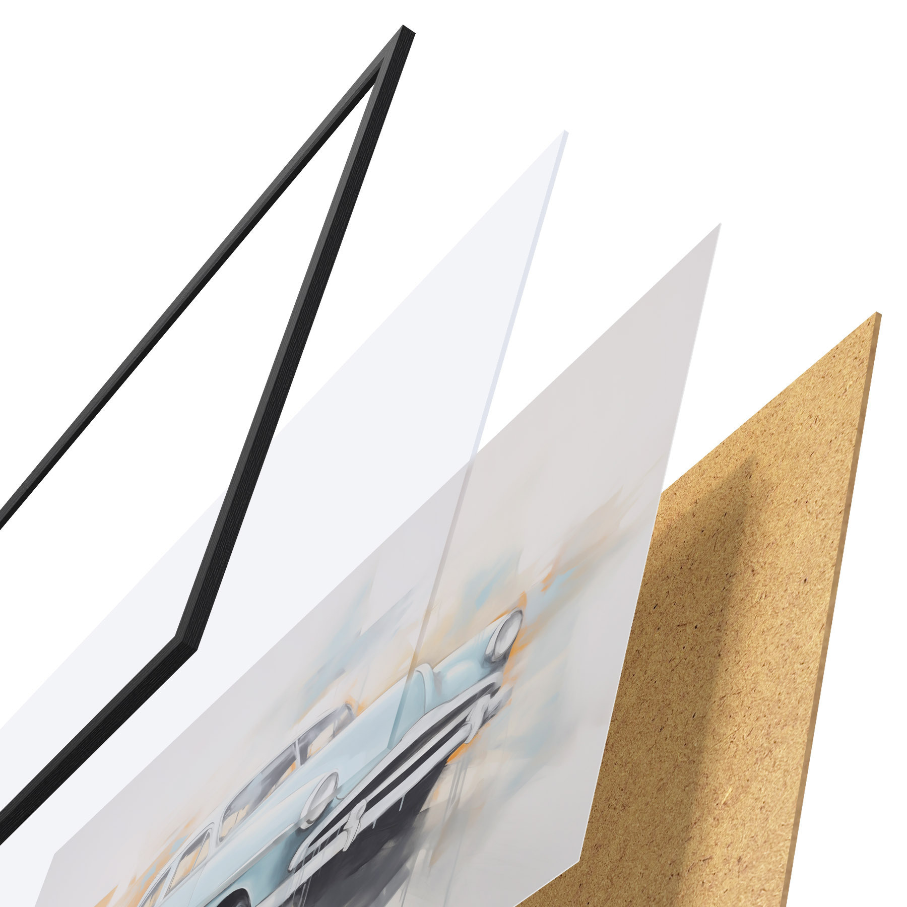 Plakát se skládá z rámu, plexiskla, tištěného obrazu a dřevotřískového podkladu. Díky úchytům na zadní straně lze plakát ihned zavěsit na zeď.