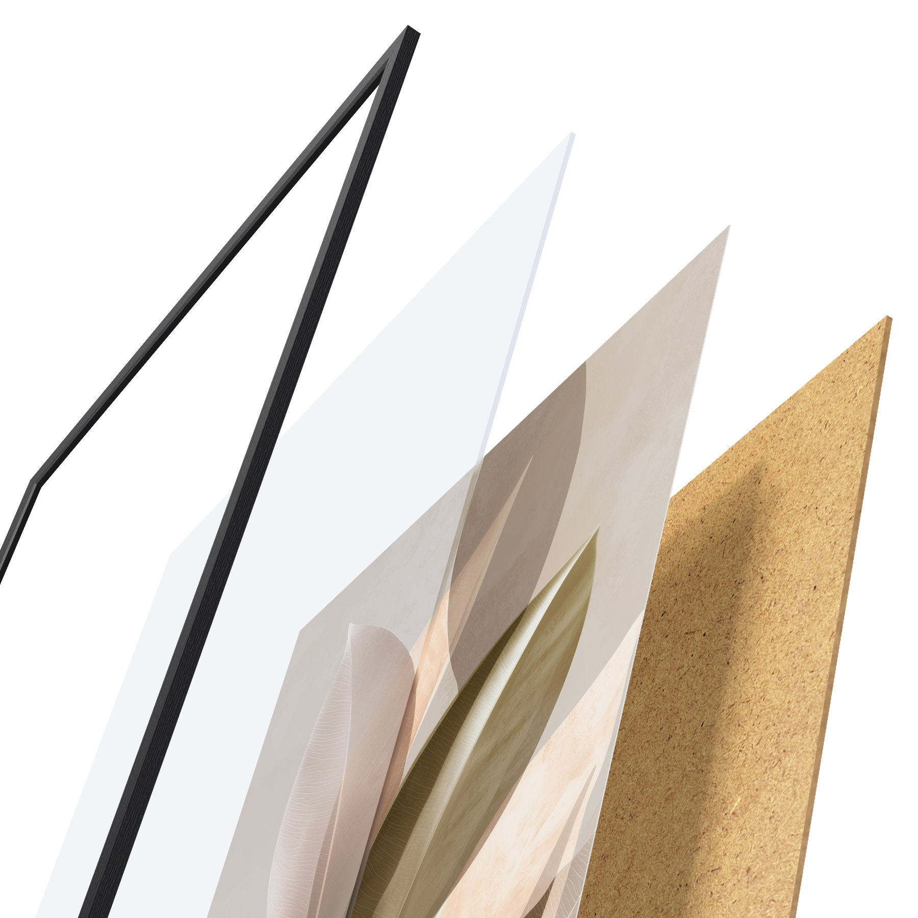 Plakát se skládá z rámu, plexiskla, tištěného obrazu a dřevotřískového podkladu. Díky úchytům na zadní straně lze plakát ihned zavěsit na zeď.