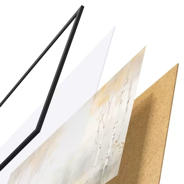Plakát se skládá z rámu, plexiskla, tištěného obrazu a dřevotřískového podkladu. Díky úchytům na zadní straně lze plakát ihned zavěsit na zeď.