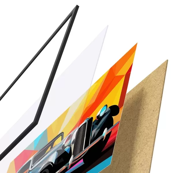 Plakát se skládá z rámu, plexiskla, tištěného obrazu a dřevotřískového podkladu. Díky úchytům na zadní straně lze plakát ihned zavěsit na zeď.
