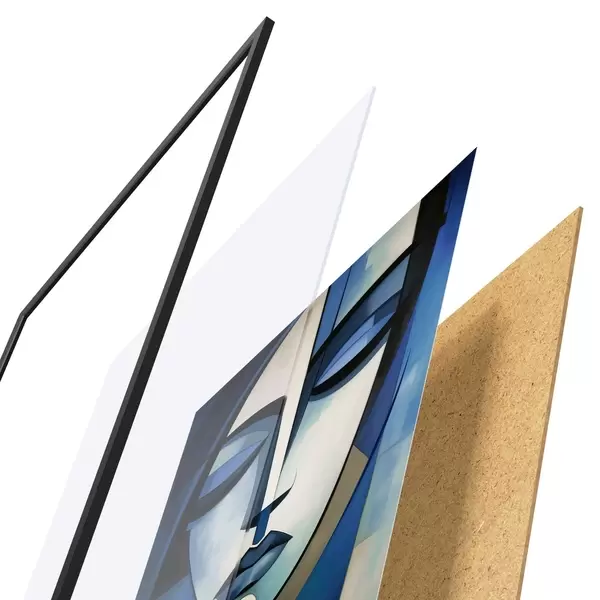 Plakát se skládá z rámu, plexiskla, tištěného obrazu a dřevotřískového podkladu. Díky úchytům na zadní straně lze plakát ihned zavěsit na zeď.