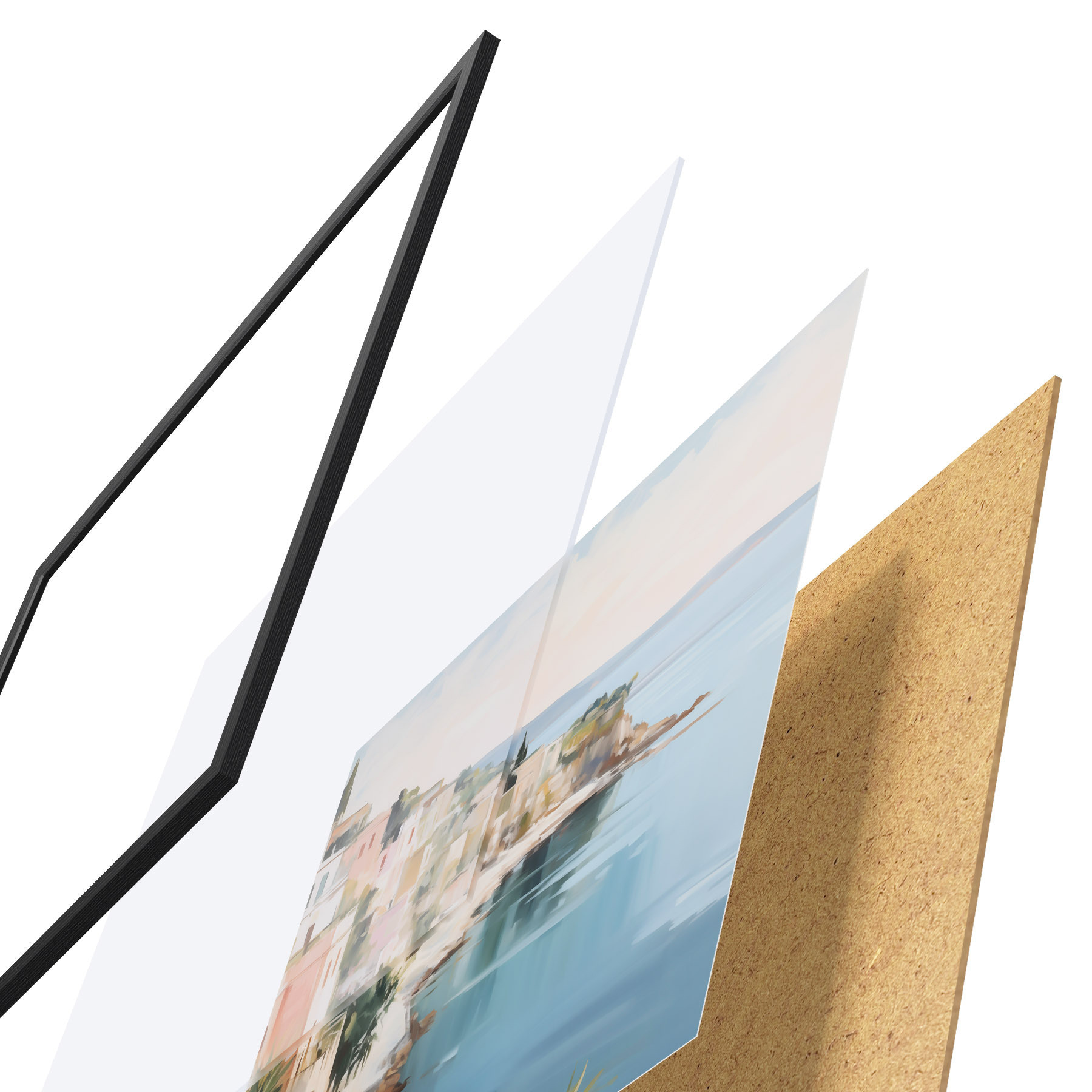 Plakát se skládá z rámu, plexiskla, tištěného obrazu a dřevotřískového podkladu. Díky úchytům na zadní straně lze plakát ihned zavěsit na zeď.