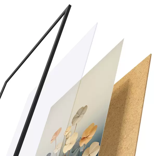Plakát se skládá z rámu, plexiskla, tištěného obrazu a dřevotřískového podkladu. Díky úchytům na zadní straně lze plakát ihned zavěsit na zeď.