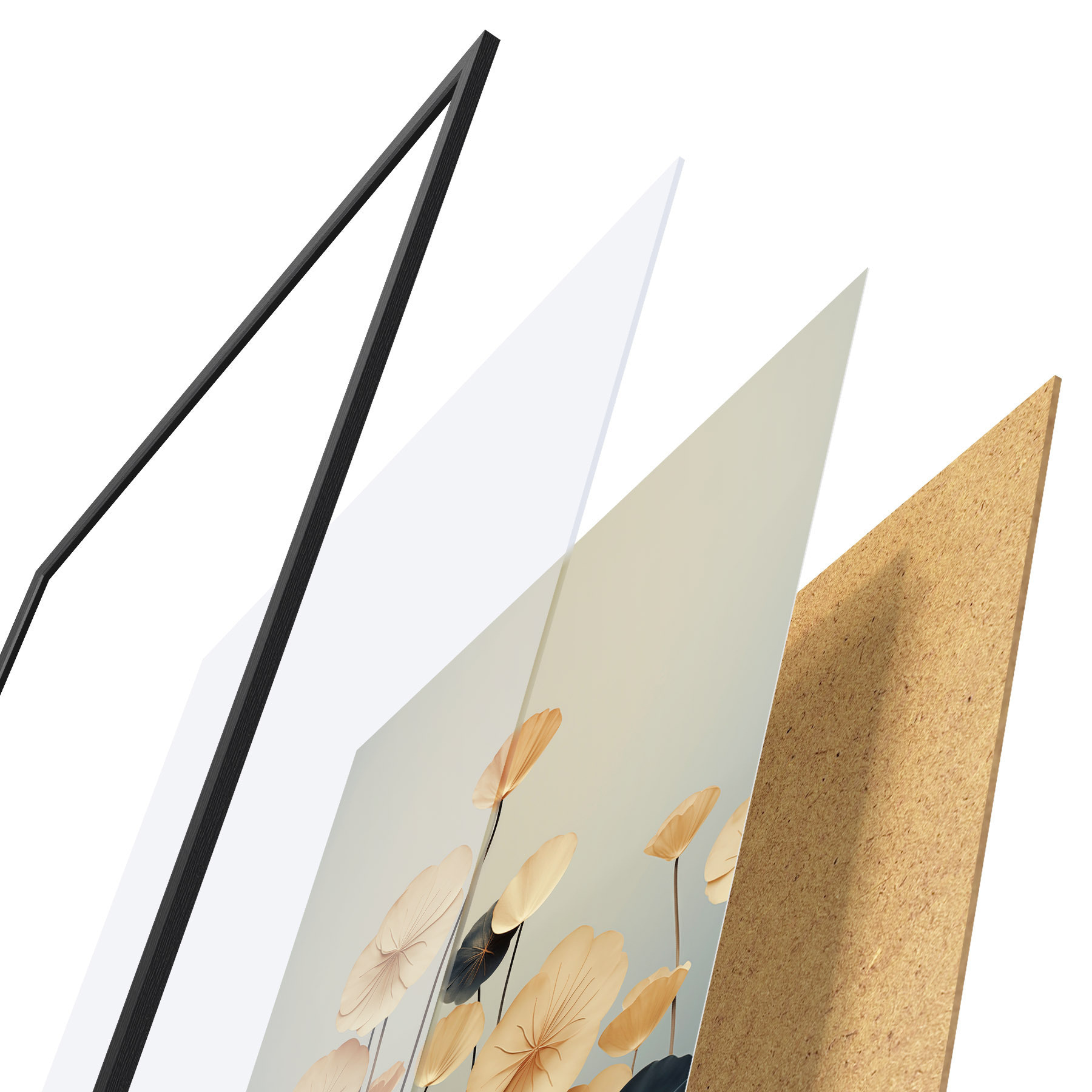 Plakát se skládá z rámu, plexiskla, tištěného obrazu a dřevotřískového podkladu. Díky úchytům na zadní straně lze plakát ihned zavěsit na zeď.