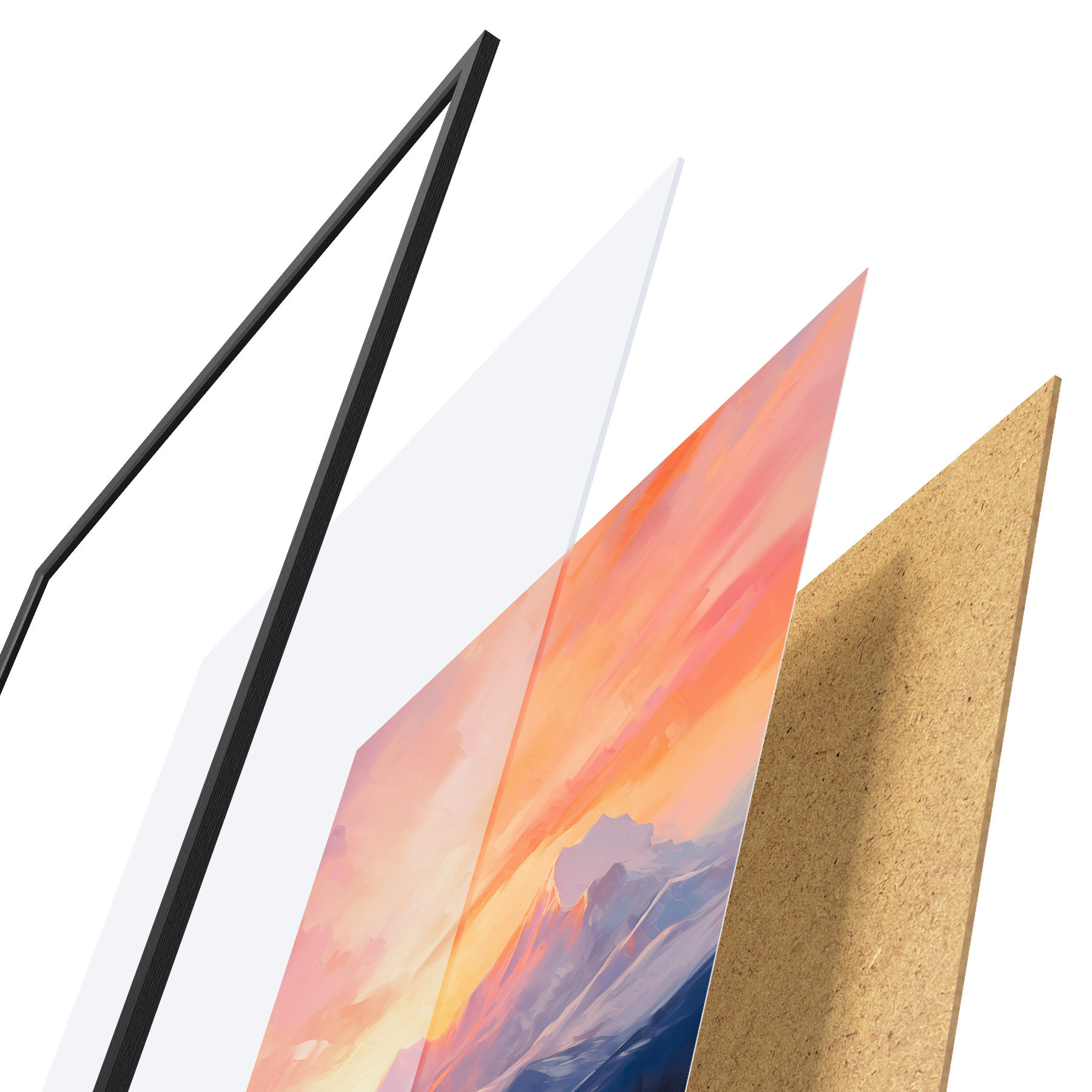 Plakát se skládá z rámu, plexiskla, tištěného obrazu a dřevotřískového podkladu. Díky úchytům na zadní straně lze plakát ihned zavěsit na zeď.