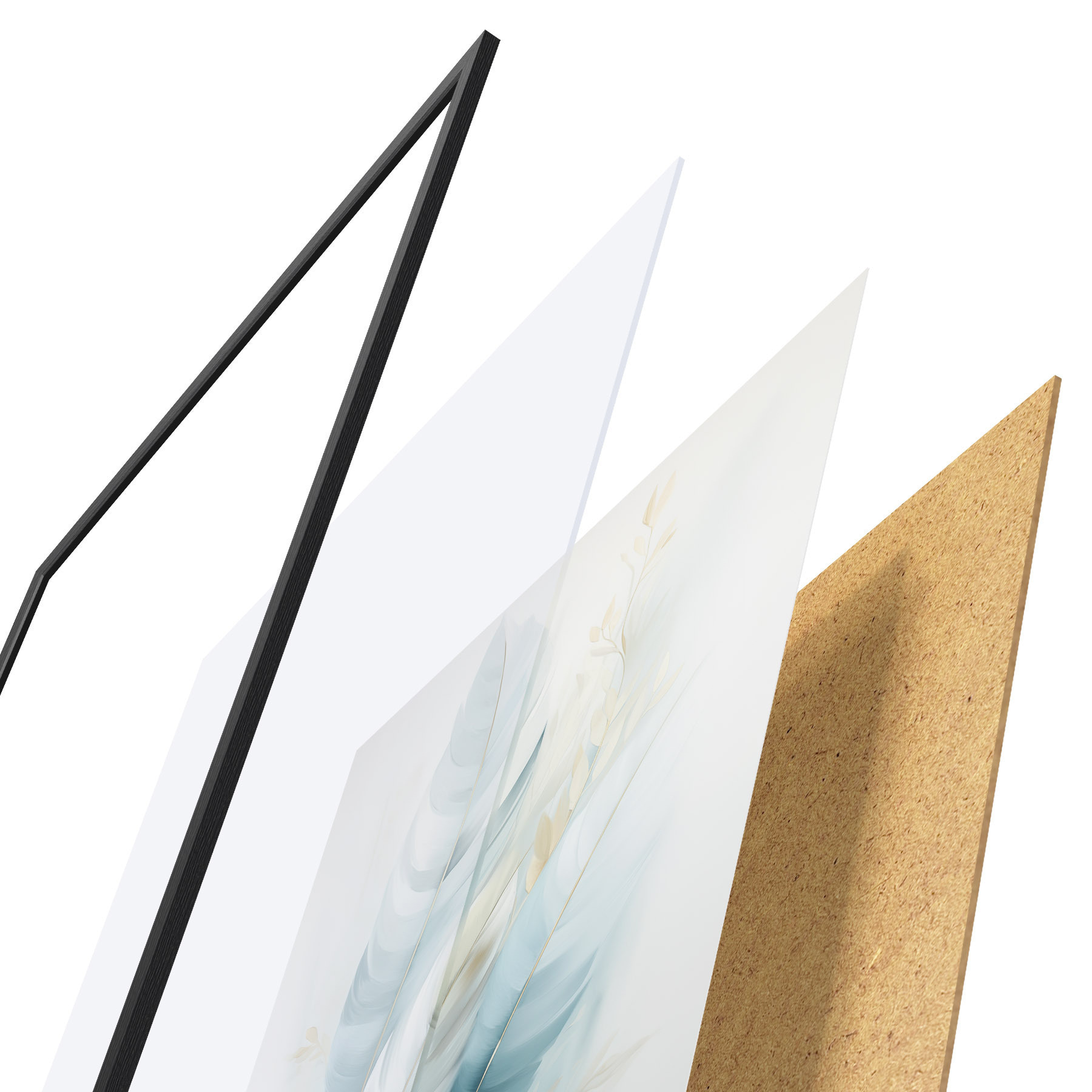 Plakát se skládá z rámu, plexiskla, tištěného obrazu a dřevotřískového podkladu. Díky úchytům na zadní straně lze plakát ihned zavěsit na zeď.