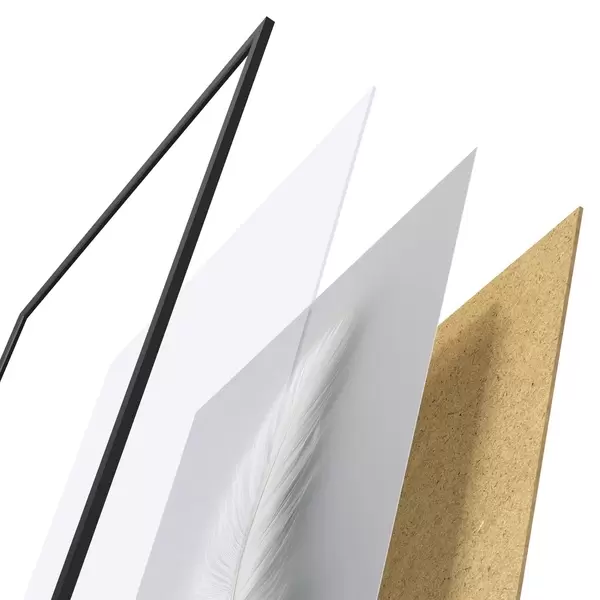 Plakát se skládá z rámu, plexiskla, tištěného obrazu a dřevotřískového podkladu. Díky úchytům na zadní straně lze plakát ihned zavěsit na zeď.