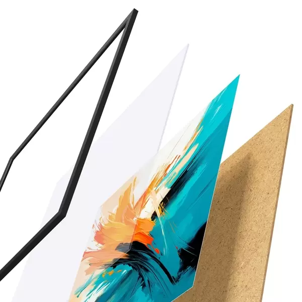Plakát se skládá z rámu, plexiskla, tištěného obrazu a dřevotřískového podkladu. Díky úchytům na zadní straně lze plakát ihned zavěsit na zeď.