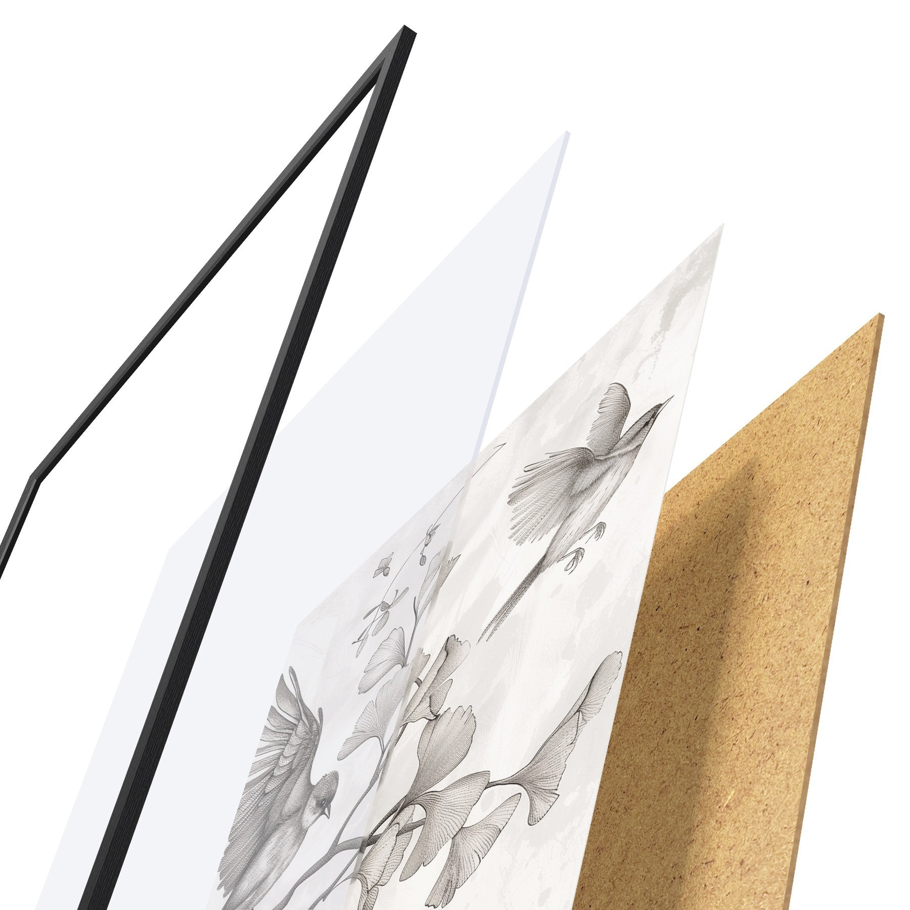 Plakát se skládá z rámu, plexiskla, tištěného obrazu a dřevotřískového podkladu. Díky úchytům na zadní straně lze plakát ihned zavěsit na zeď.