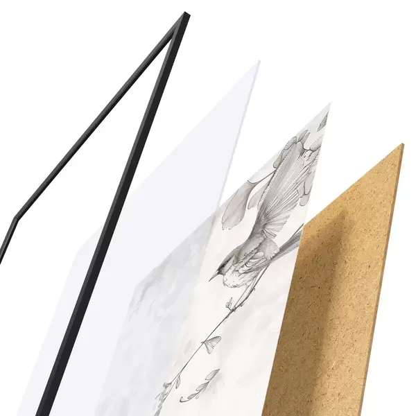 Plakát se skládá z rámu, plexiskla, tištěného obrazu a dřevotřískového podkladu. Díky úchytům na zadní straně lze plakát ihned zavěsit na zeď.