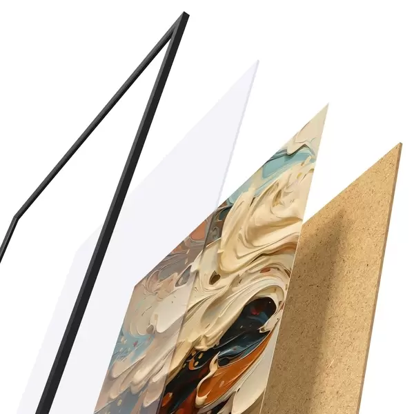 Plakát se skládá z rámu, plexiskla, tištěného obrazu a dřevotřískového podkladu. Díky úchytům na zadní straně lze plakát ihned zavěsit na zeď.