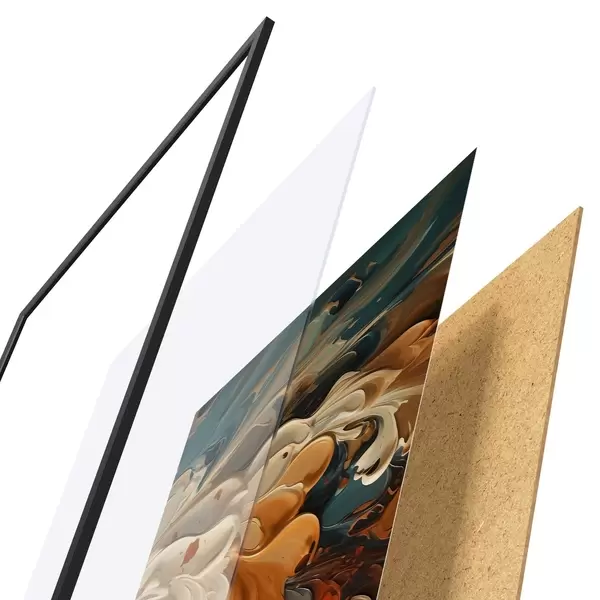 Plakát se skládá z rámu, plexiskla, tištěného obrazu a dřevotřískového podkladu. Díky úchytům na zadní straně lze plakát ihned zavěsit na zeď.