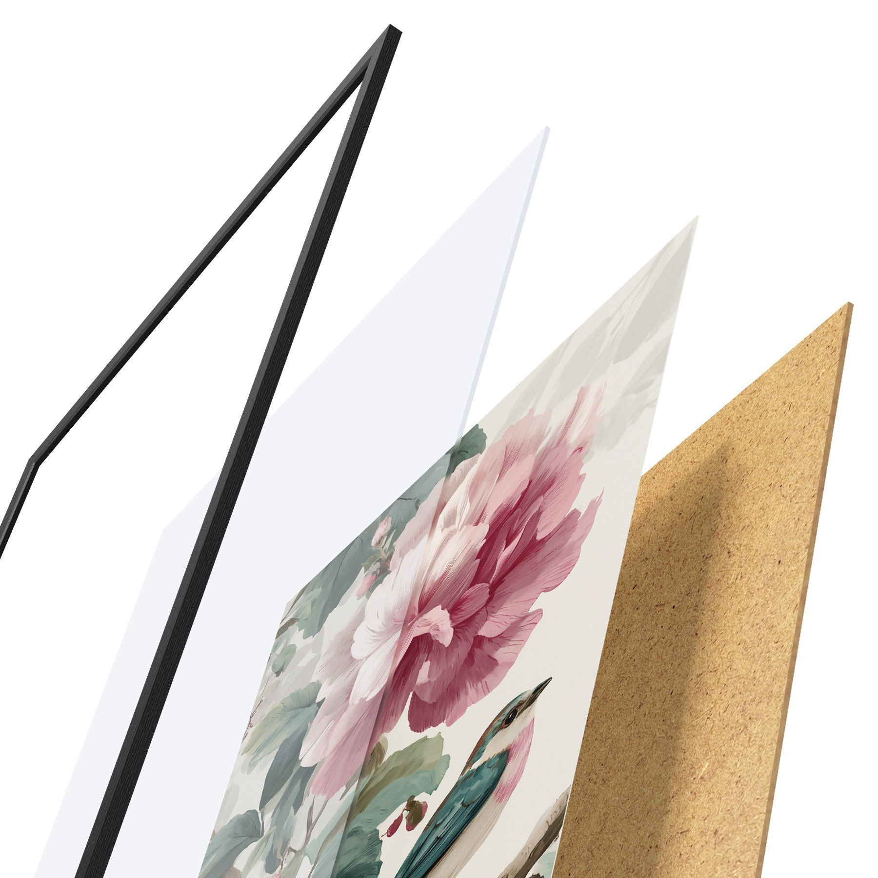 Plakát se skládá z rámu, plexiskla, tištěného obrazu a dřevotřískového podkladu. Díky úchytům na zadní straně lze plakát ihned zavěsit na zeď.