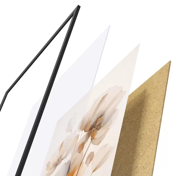 Plakát se skládá z rámu, plexiskla, tištěného obrazu a dřevotřískového podkladu. Díky úchytům na zadní straně lze plakát ihned zavěsit na zeď.