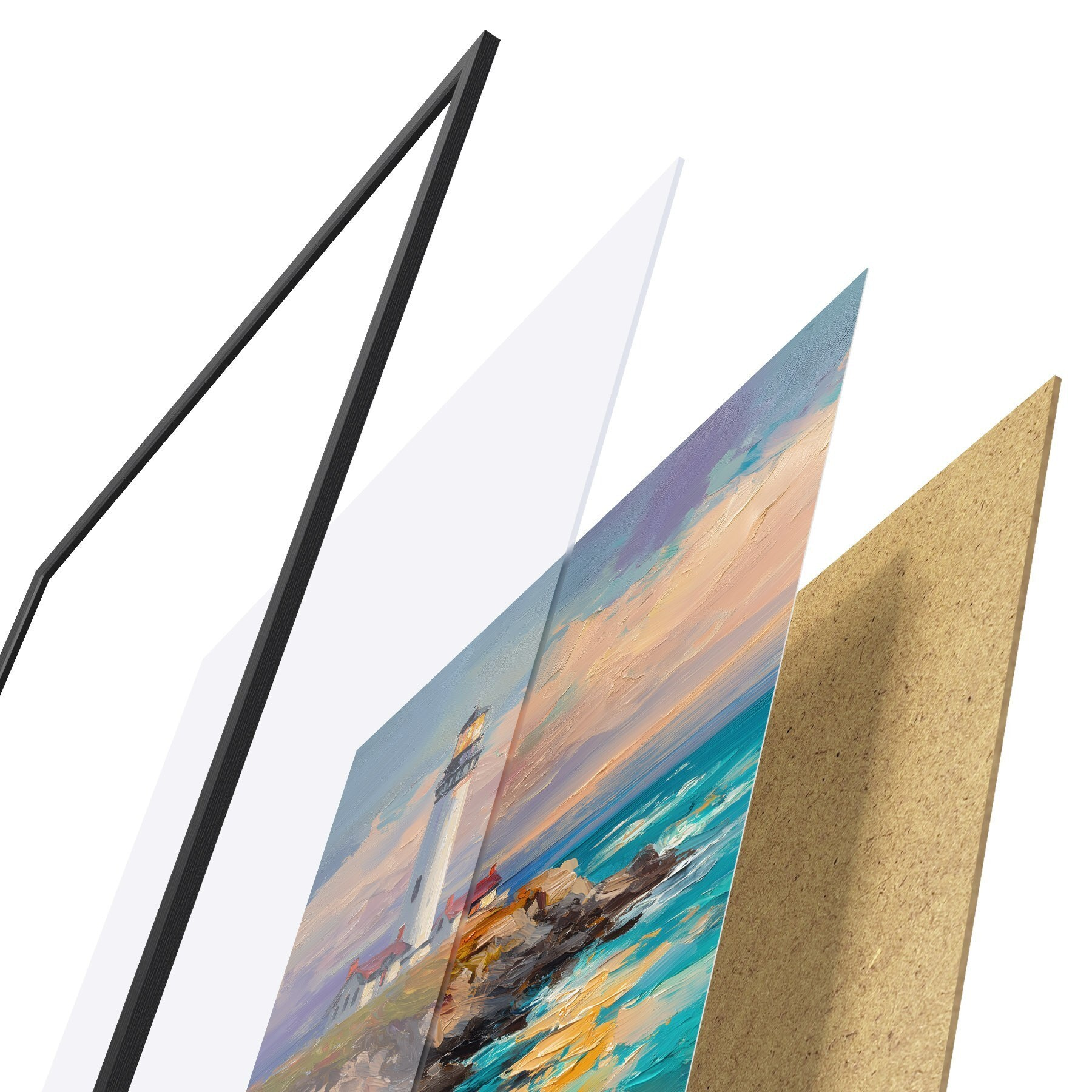 Plakát se skládá z rámu, plexiskla, tištěného obrazu a dřevotřískového podkladu. Díky úchytům na zadní straně lze plakát ihned zavěsit na zeď.