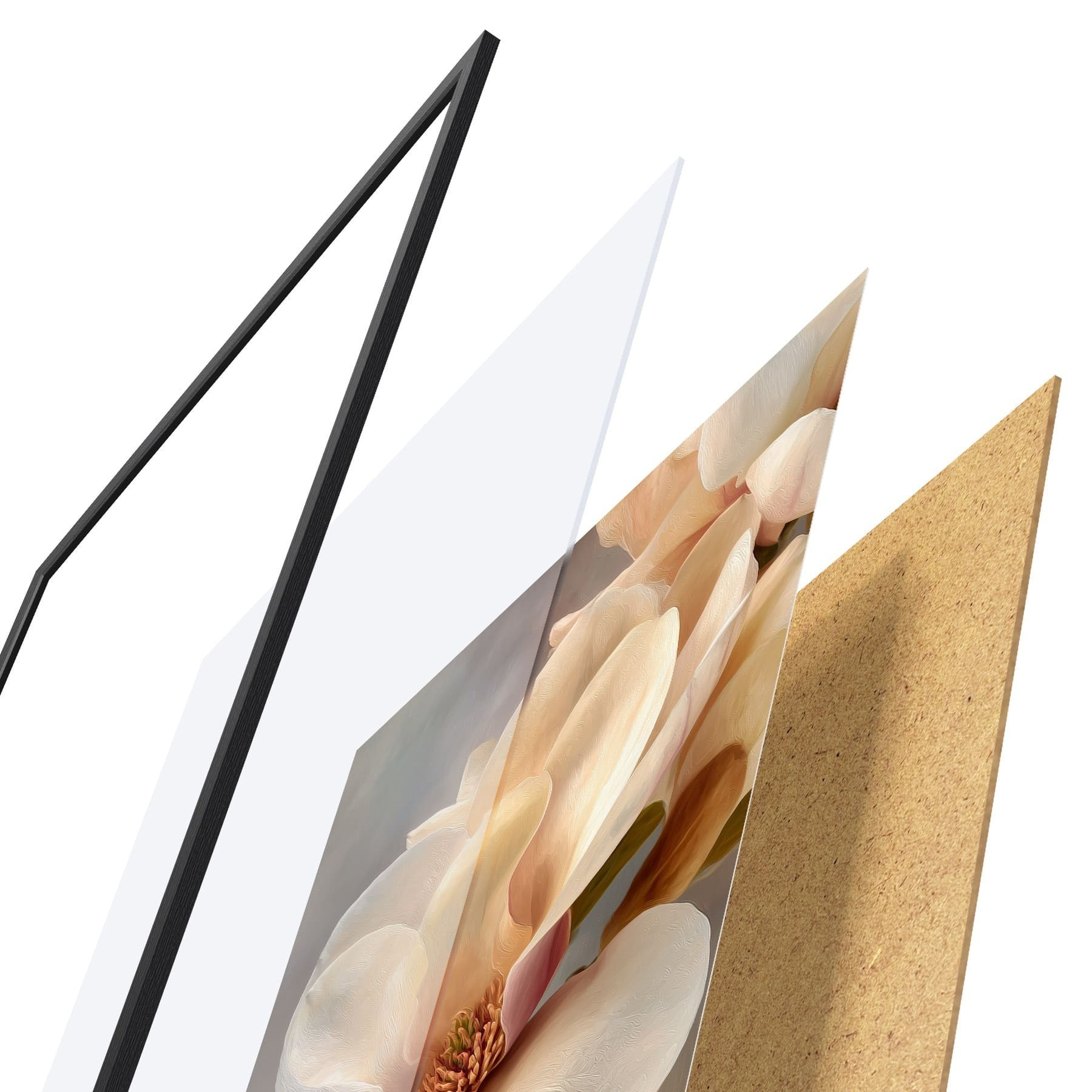 Plakát se skládá z rámu, plexiskla, tištěného obrazu a dřevotřískového podkladu. Díky úchytům na zadní straně lze plakát ihned zavěsit na zeď.