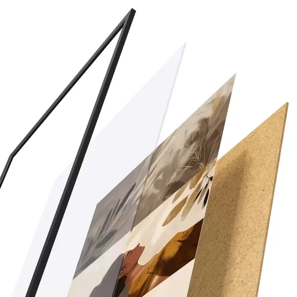 Plakát se skládá z rámu, plexiskla, tištěného obrazu a dřevotřískového podkladu. Díky úchytům na zadní straně lze plakát ihned zavěsit na zeď.