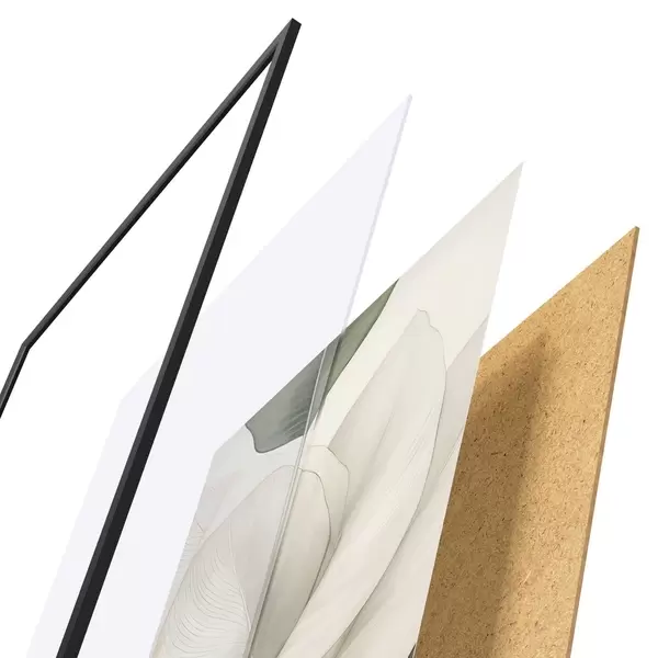 Plakát se skládá z rámu, plexiskla, tištěného obrazu a dřevotřískového podkladu. Díky úchytům na zadní straně lze plakát ihned zavěsit na zeď.