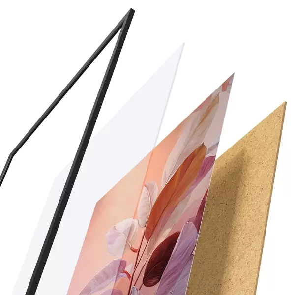 Plakát se skládá z rámu, plexiskla, tištěného obrazu a dřevotřískového podkladu. Díky úchytům na zadní straně lze plakát ihned zavěsit na zeď.