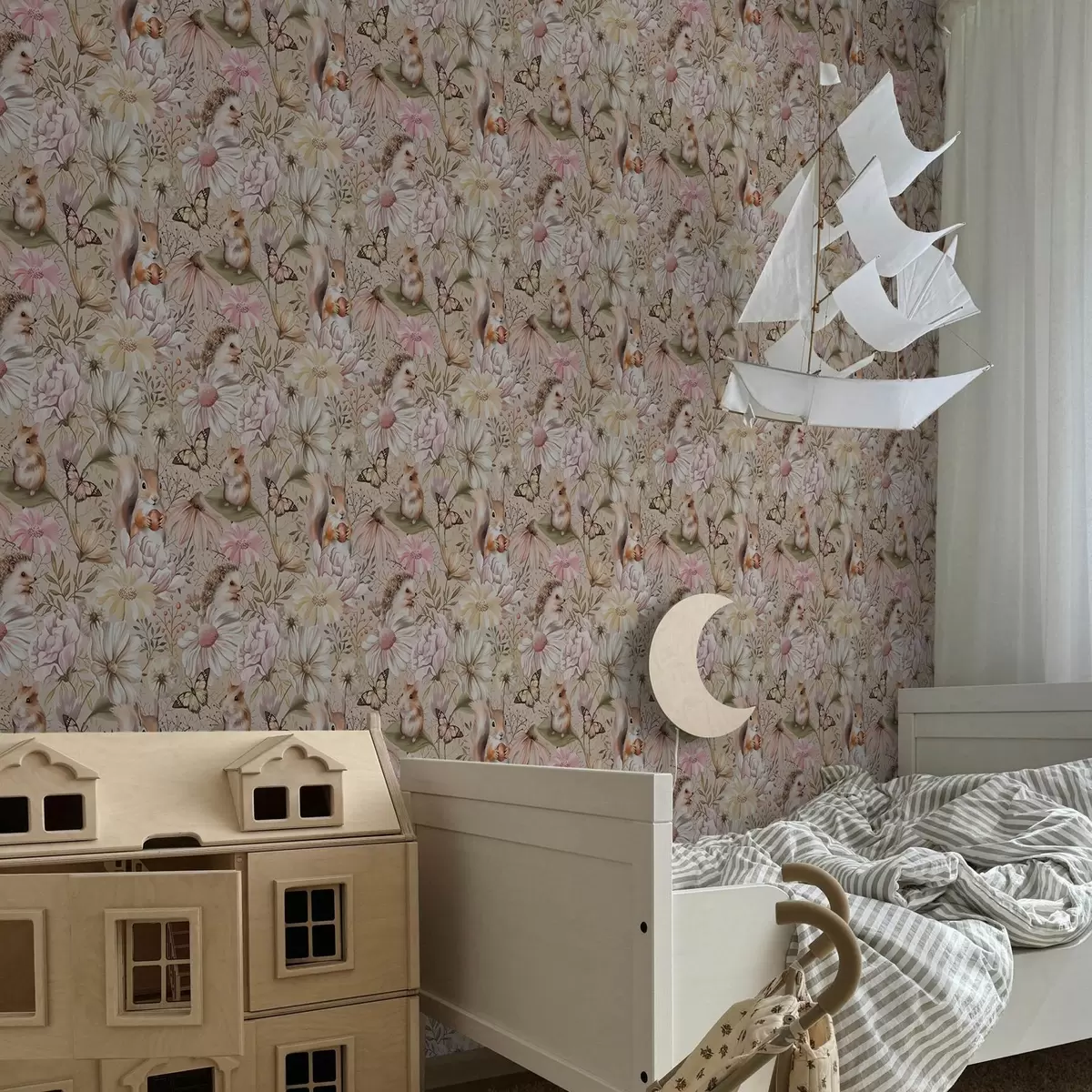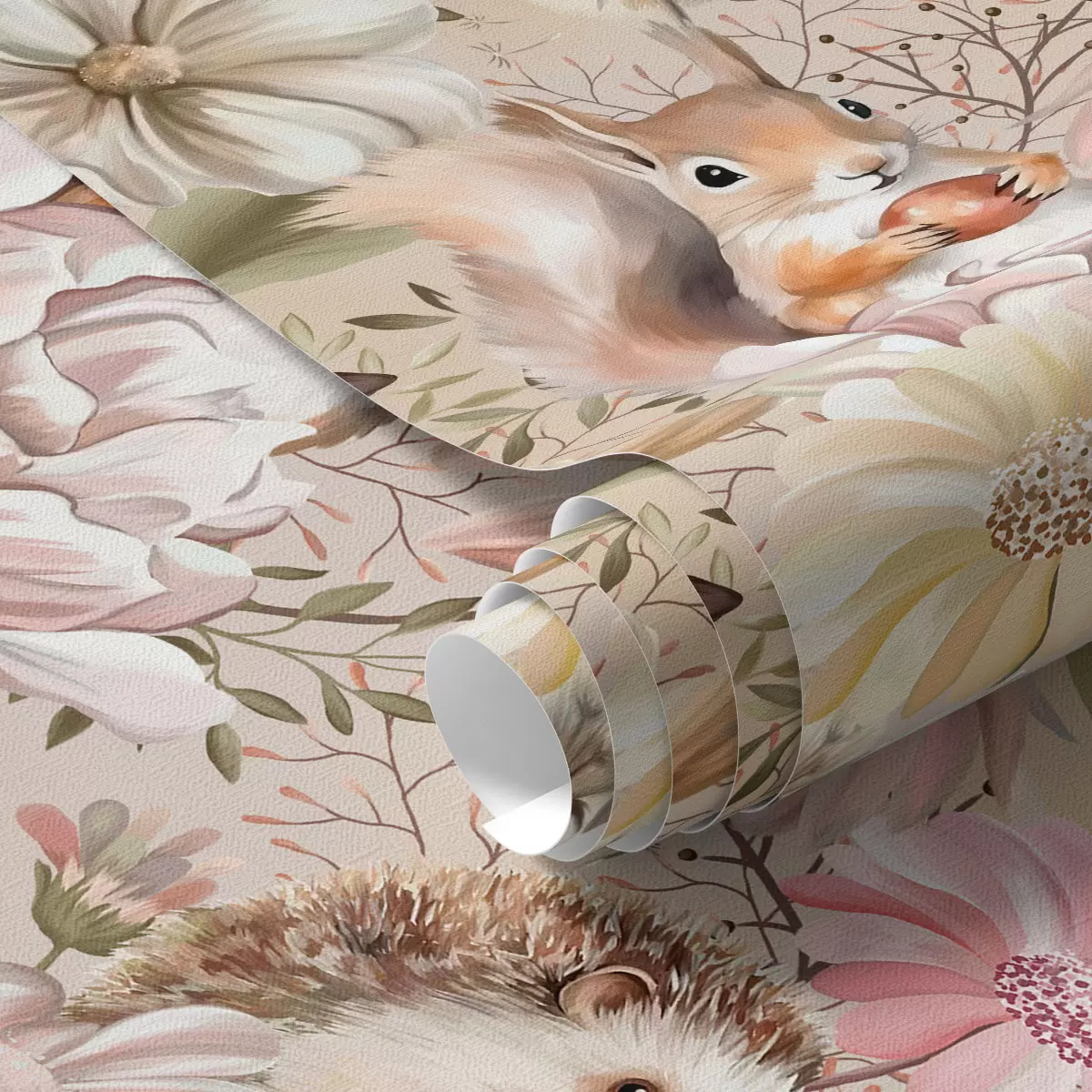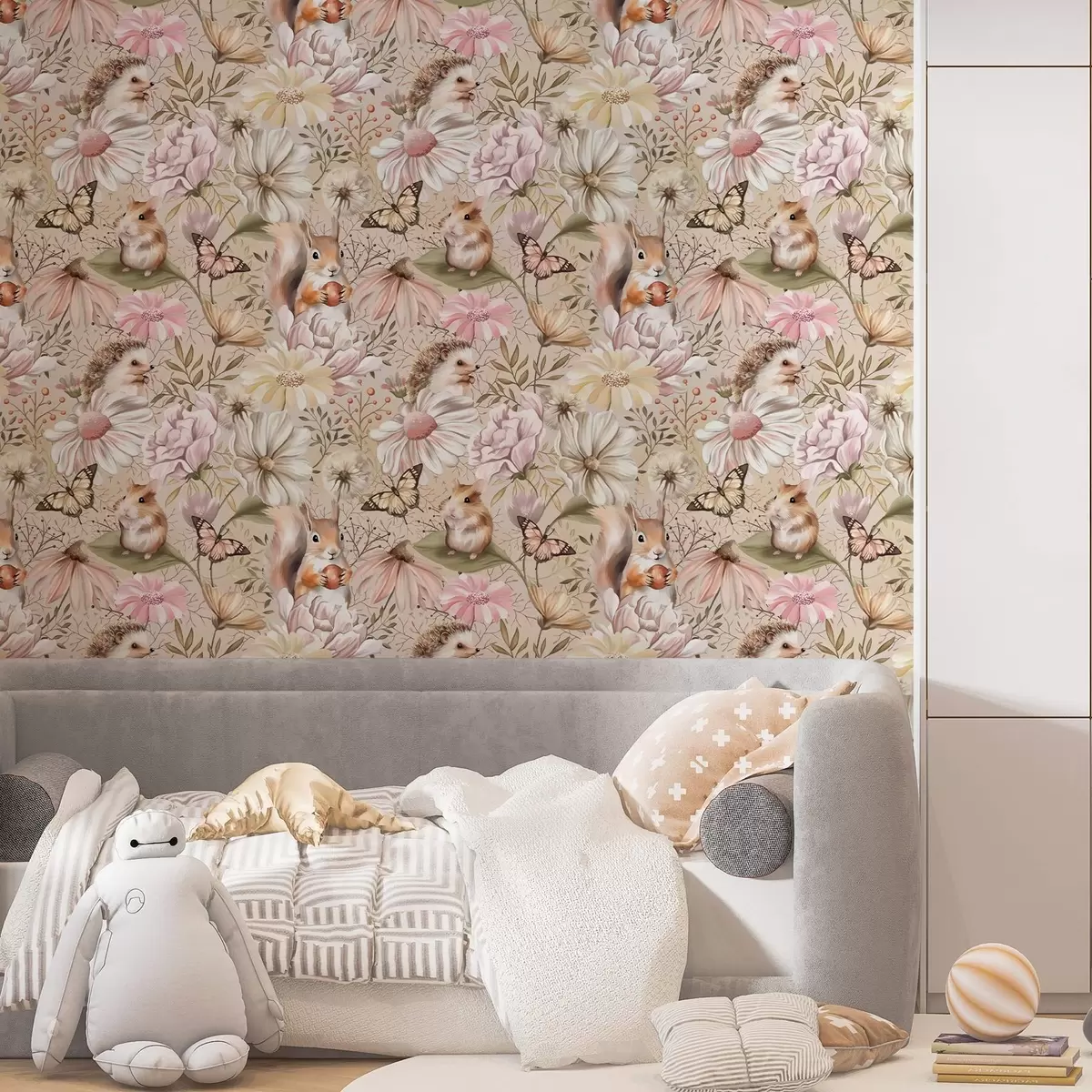 Tapeta Roztomilý ježek, veverka, křeček a motýli s květinami v pastelových barvách Nr. a00051