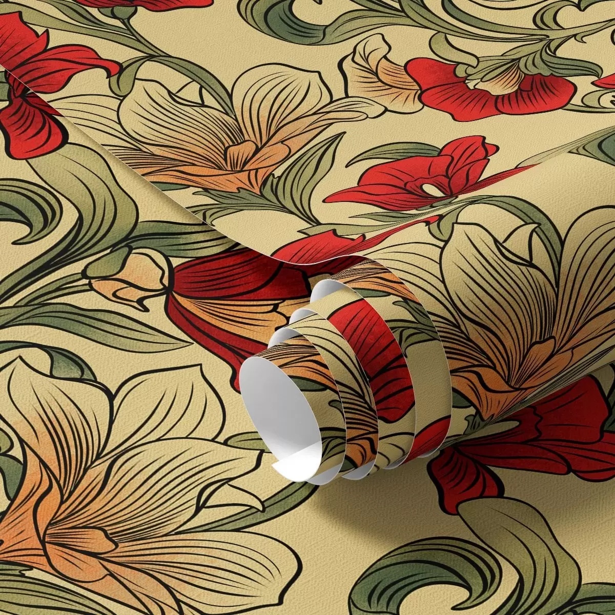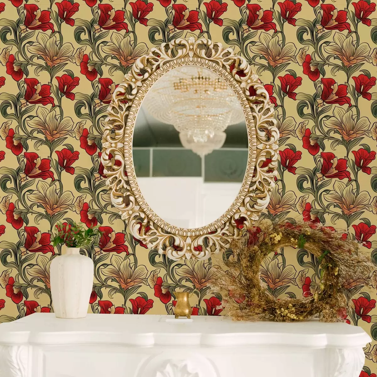 Tapeta Světlé zkroucené stonky s listy a červenými květy Nr. a00075