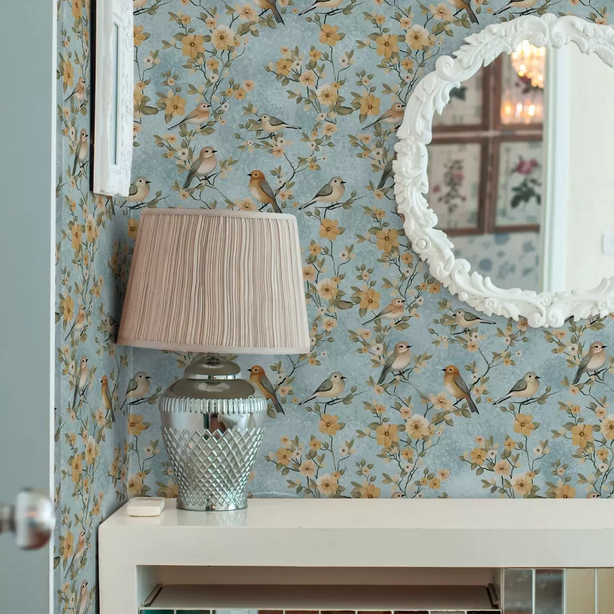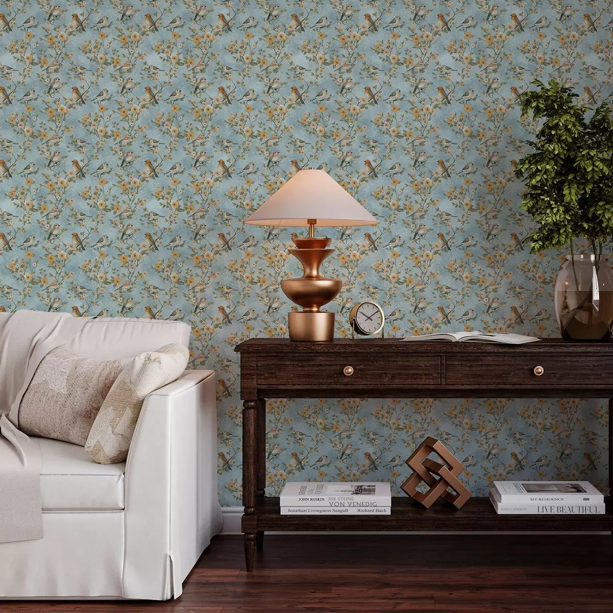 Tapeta Malí ptáci na větvích na modrém pozadí Nr. a00092
