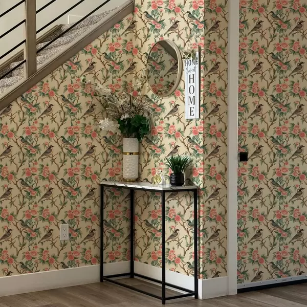 Tapeta Malí ptáci na větvích s květinami na světlém pozadí Nr. a00093