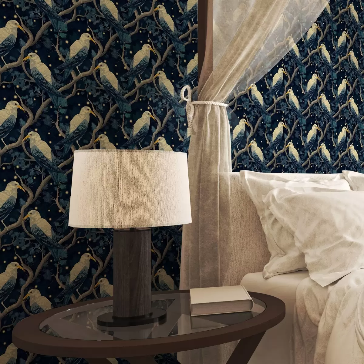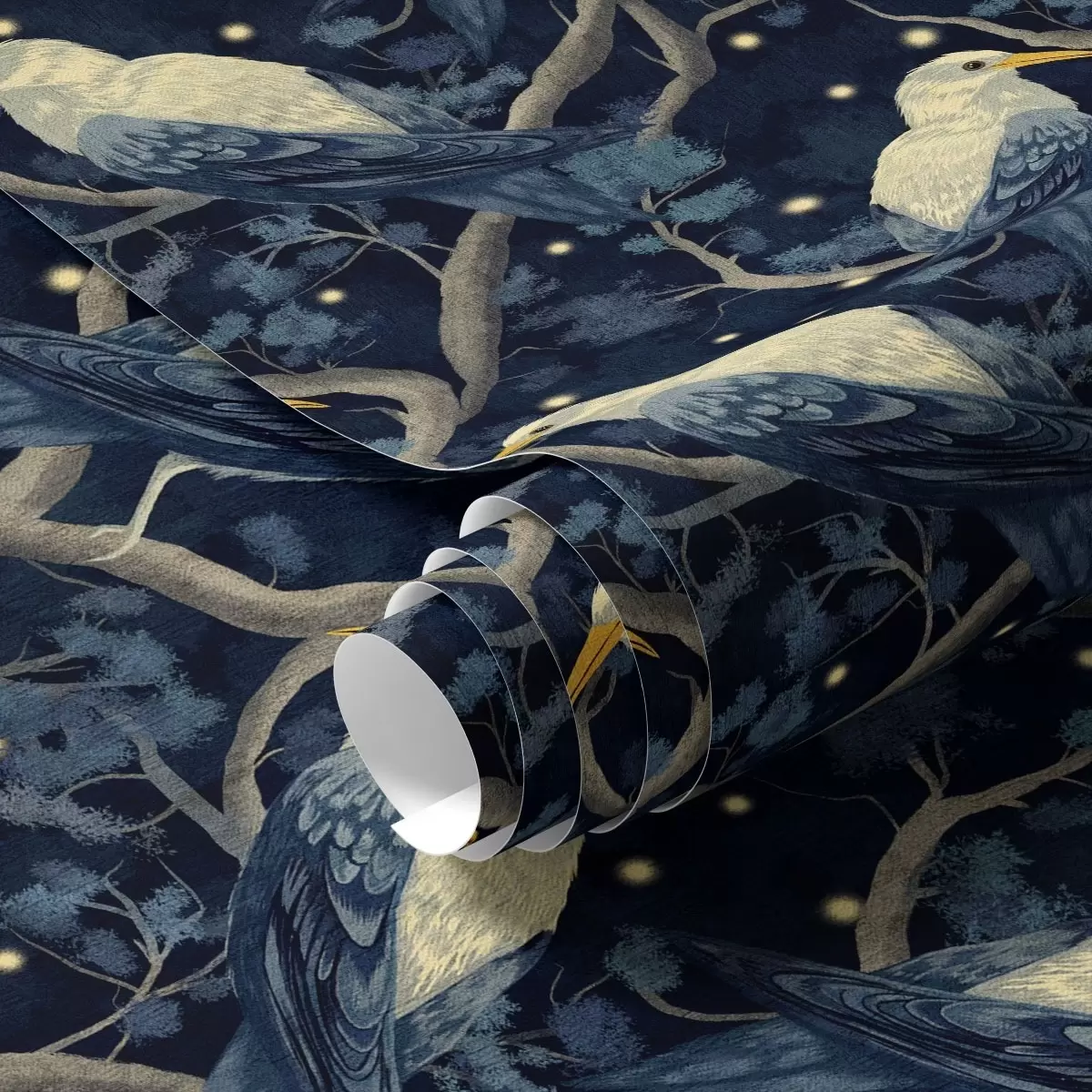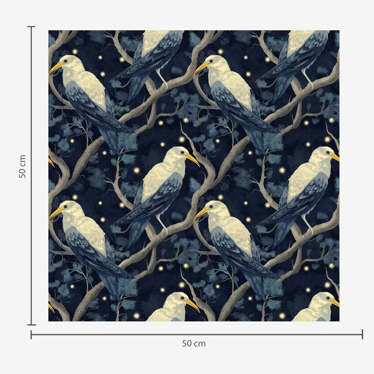 Tapeta Bílí ptáci na větvích mezi zářícími světluškami v nočním lese Nr. a00109
